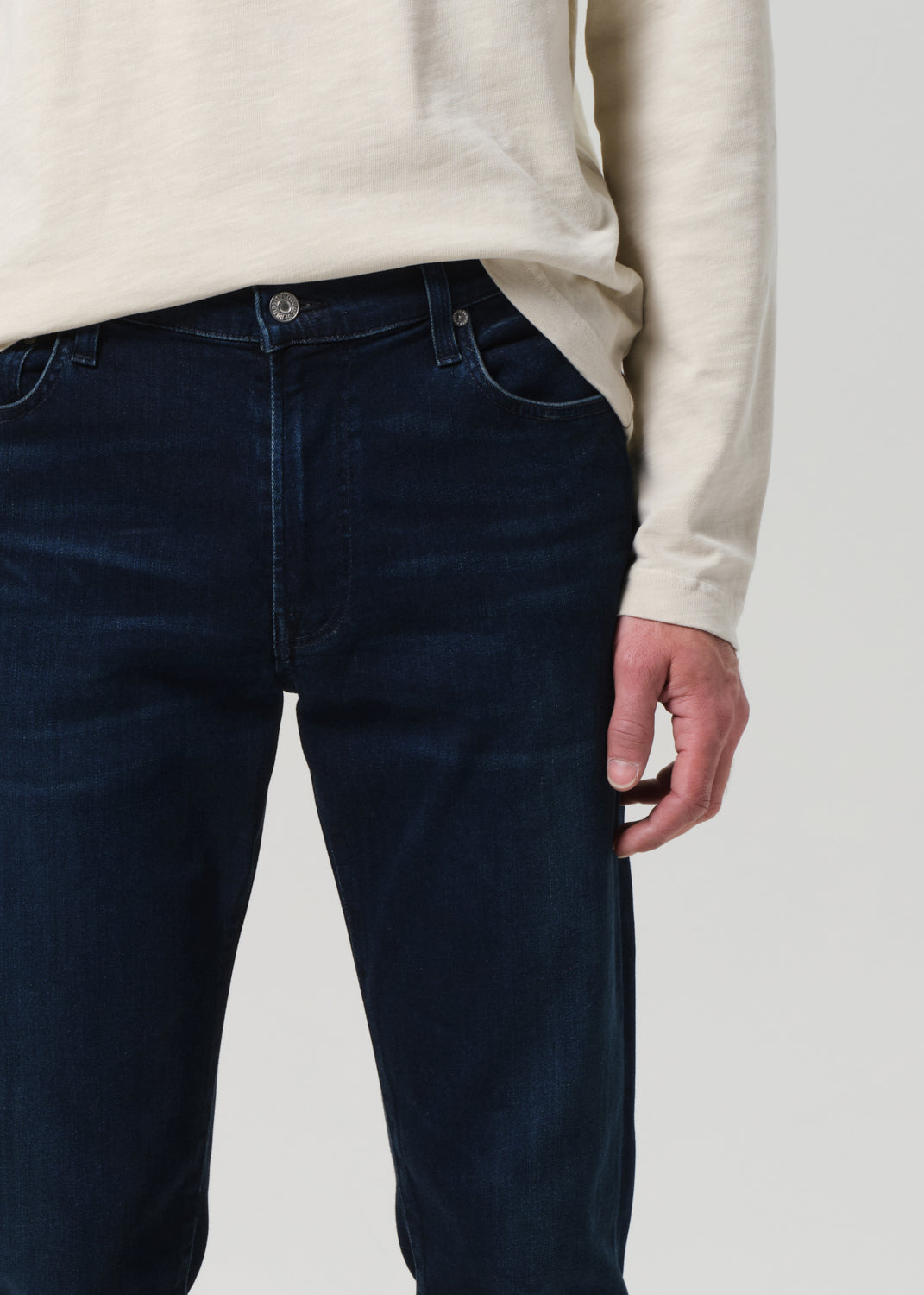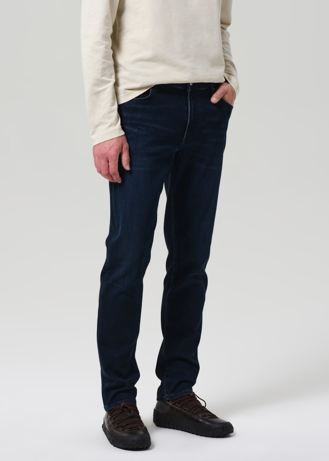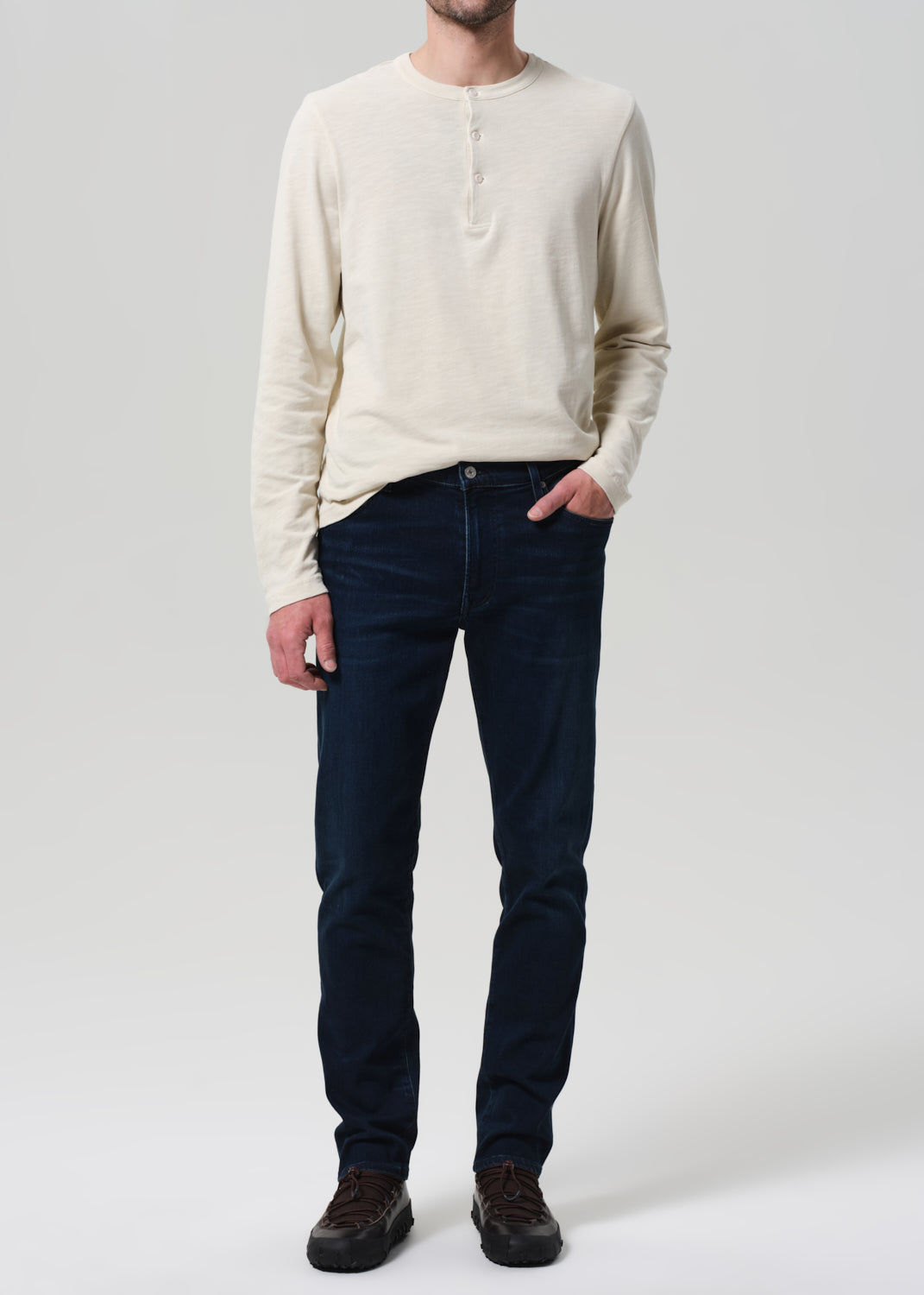 The Adler is our slim straight fit—slightly higher rise, room through the thigh, and a subtle taper from knee to ankle. Crafted from soft, lightweight stretch denim, this pair is finished in a deep indigo wash with subtle fading and whiskering for a lived-in feel.
