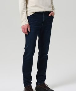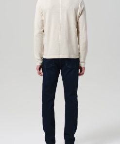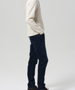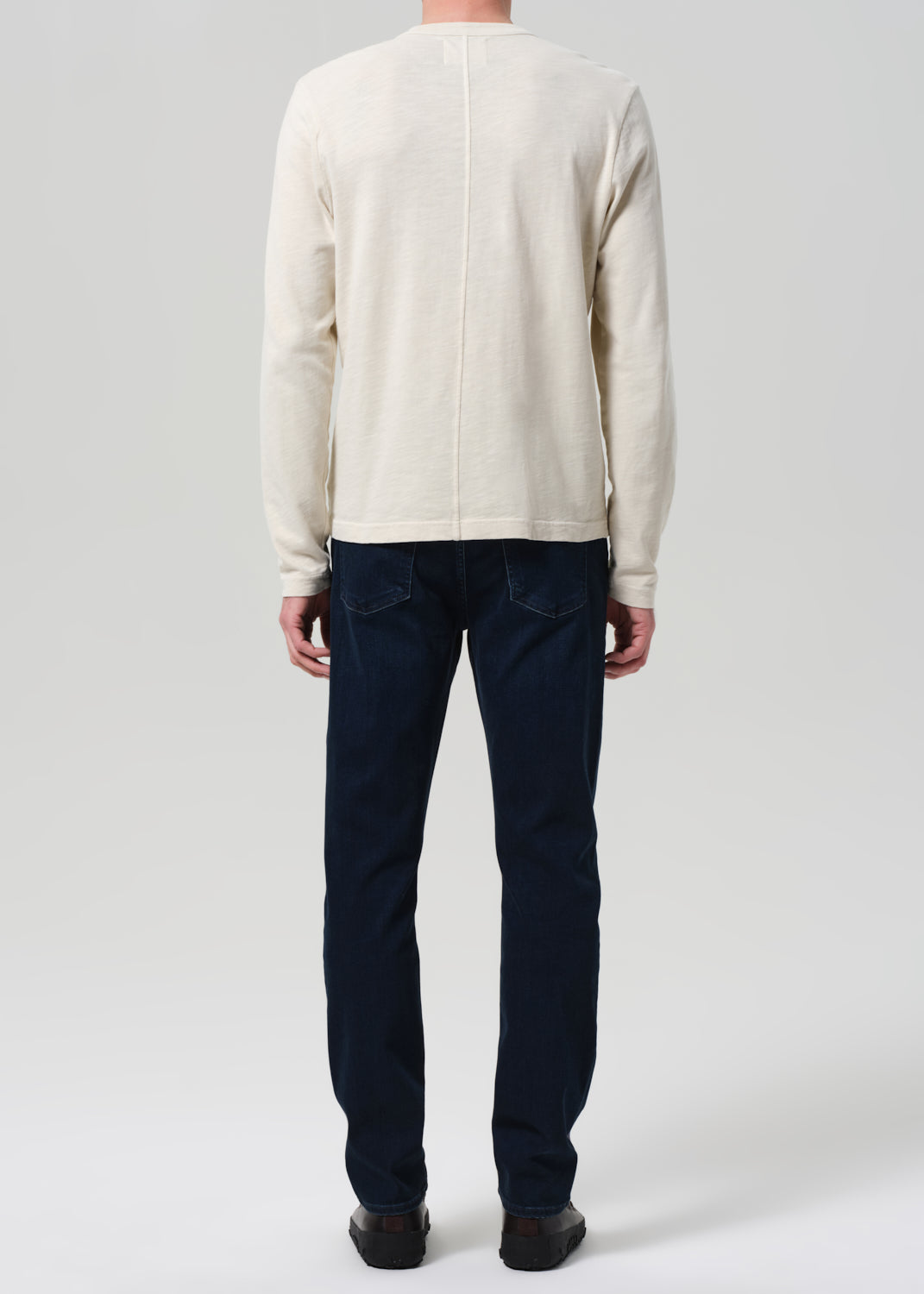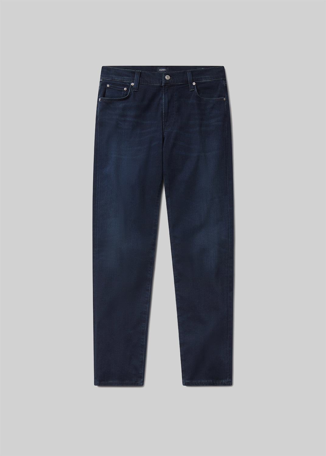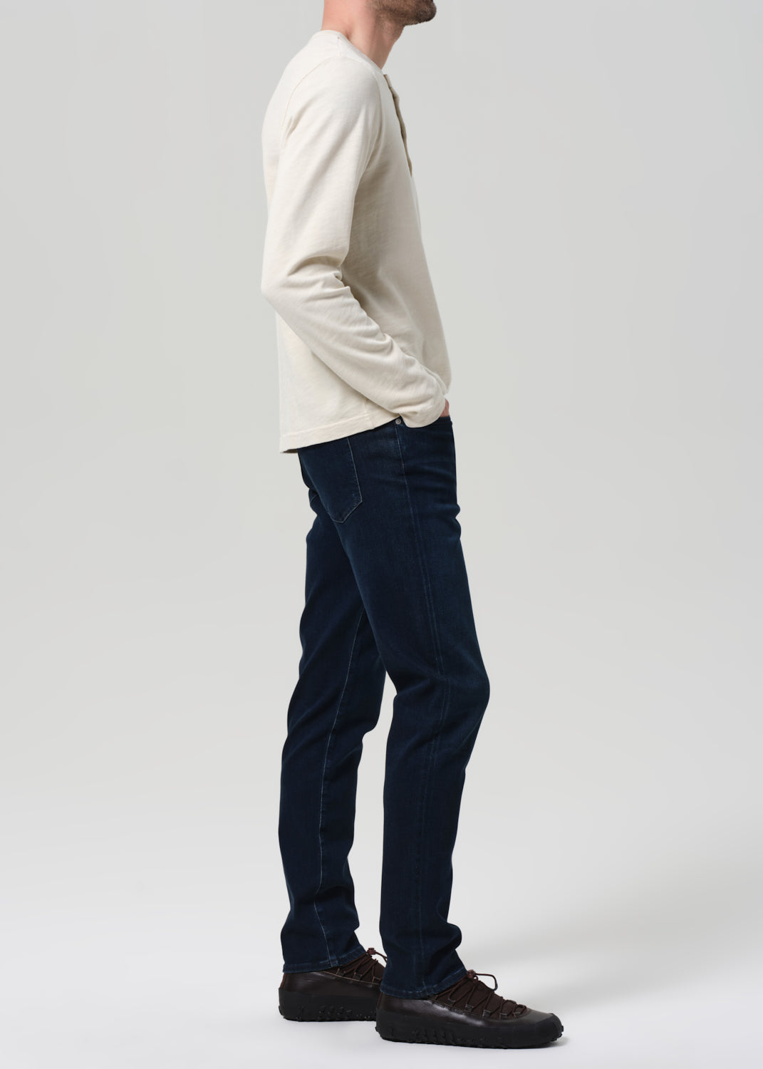 The Adler is our slim straight fit—slightly higher rise, room through the thigh, and a subtle taper from knee to ankle. Crafted from soft, lightweight stretch denim, this pair is finished in a deep indigo wash with subtle fading and whiskering for a lived-in feel.