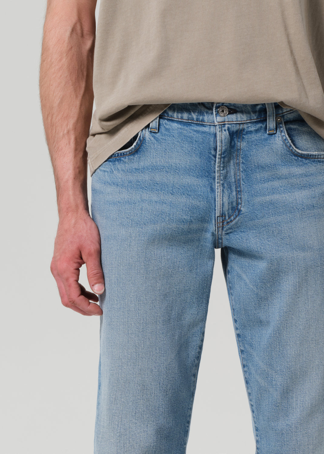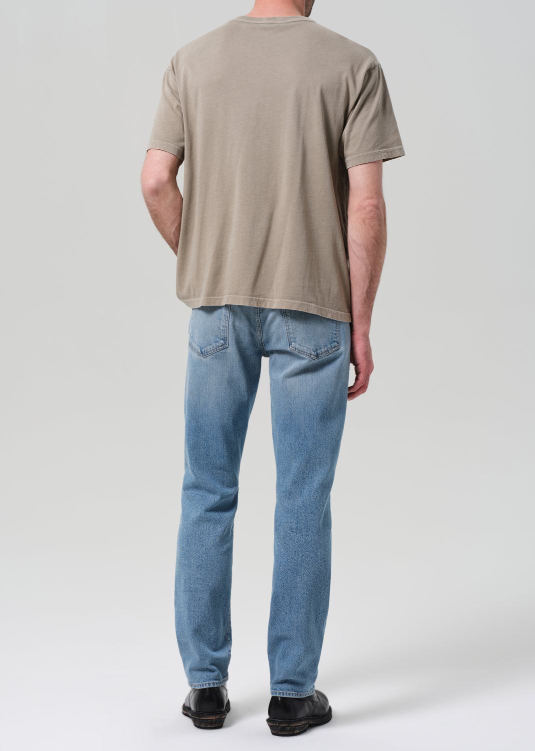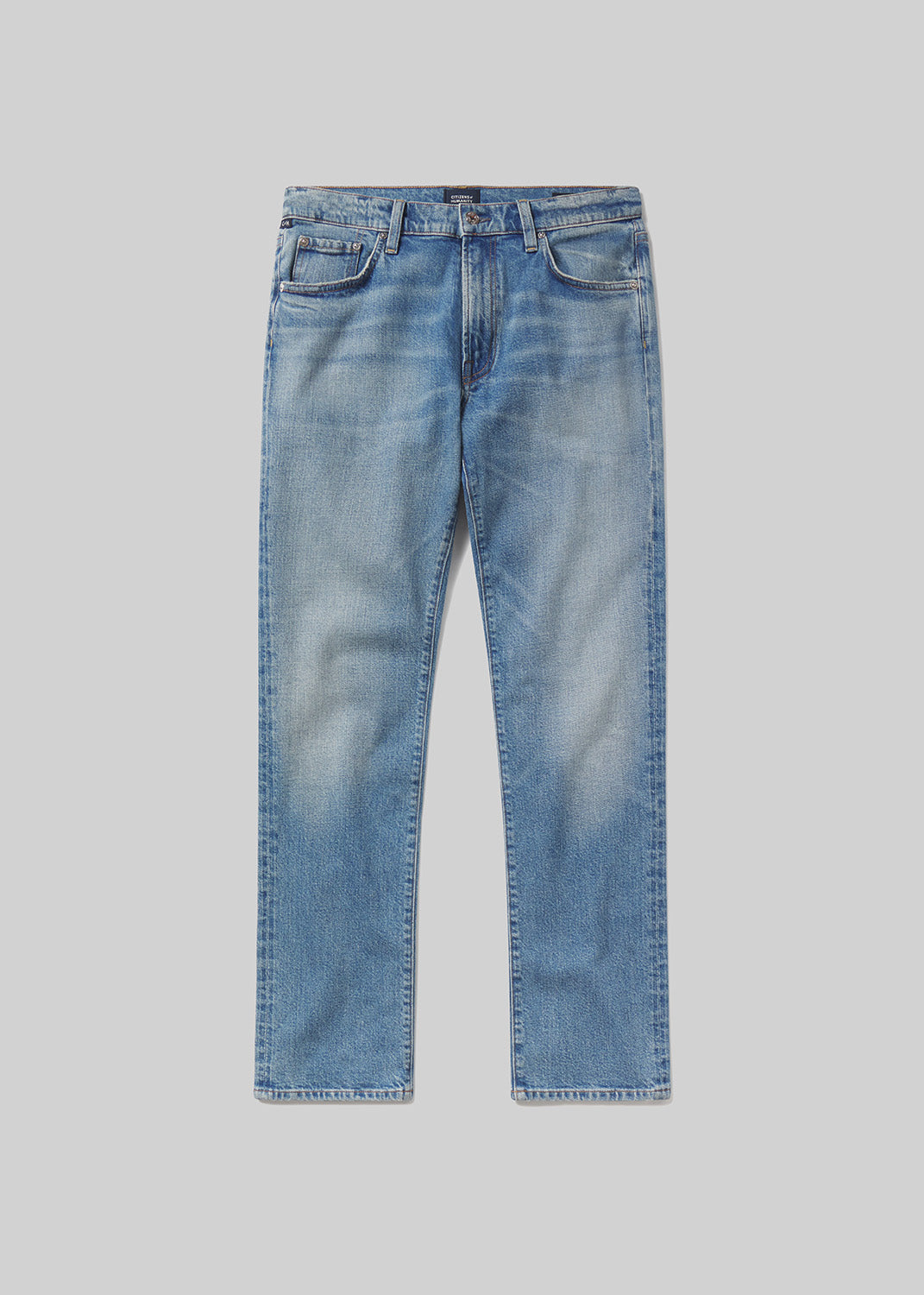 The Gage is our classic straight fit, designed with a relaxed upper block and a clean, tailored leg. Crafted from comfort stretch archive denim, it offers a soft yet substantial hand for everyday wear. Bauhaus is a light-to-medium indigo wash with subtle fading and marbling for a broken-in, vintage-inspired look.