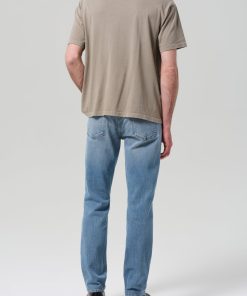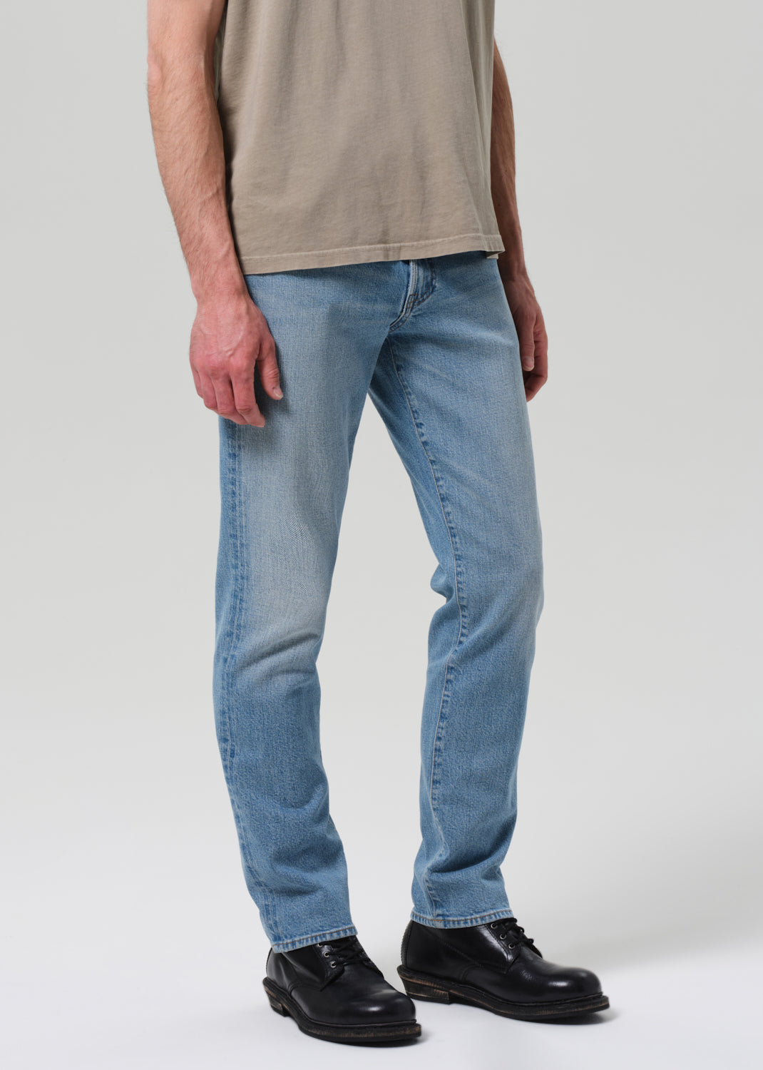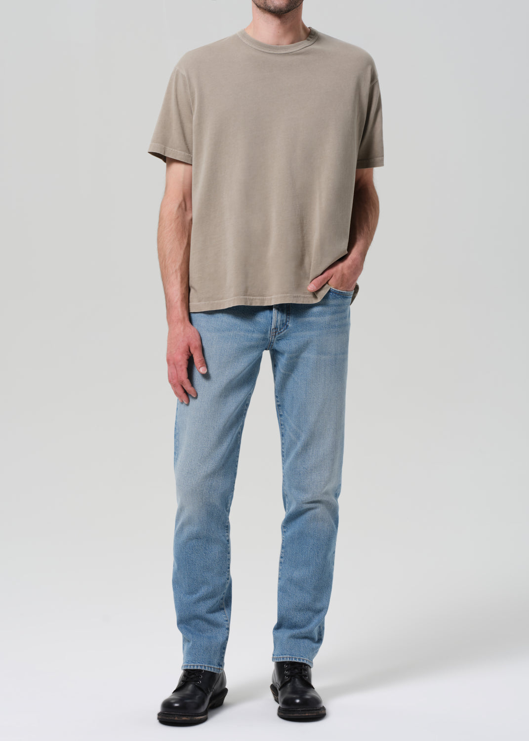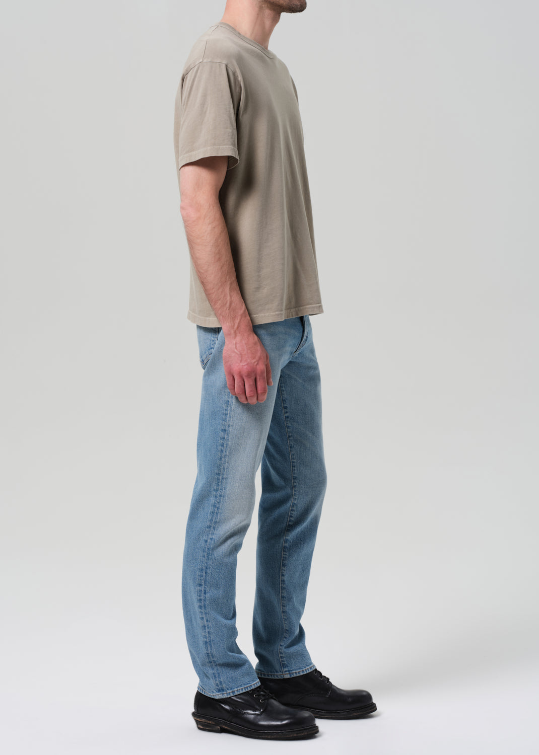 The Gage is our classic straight fit, designed with a relaxed upper block and a clean, tailored leg. Crafted from comfort stretch archive denim, it offers a soft yet substantial hand for everyday wear. Bauhaus is a light-to-medium indigo wash with subtle fading and marbling for a broken-in, vintage-inspired look.
