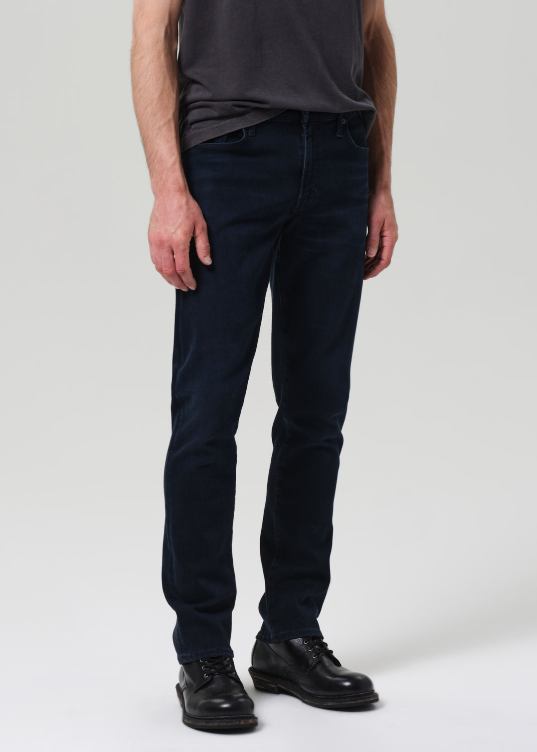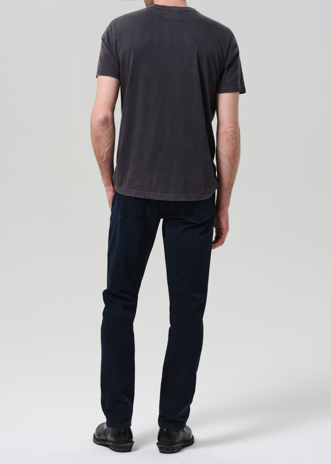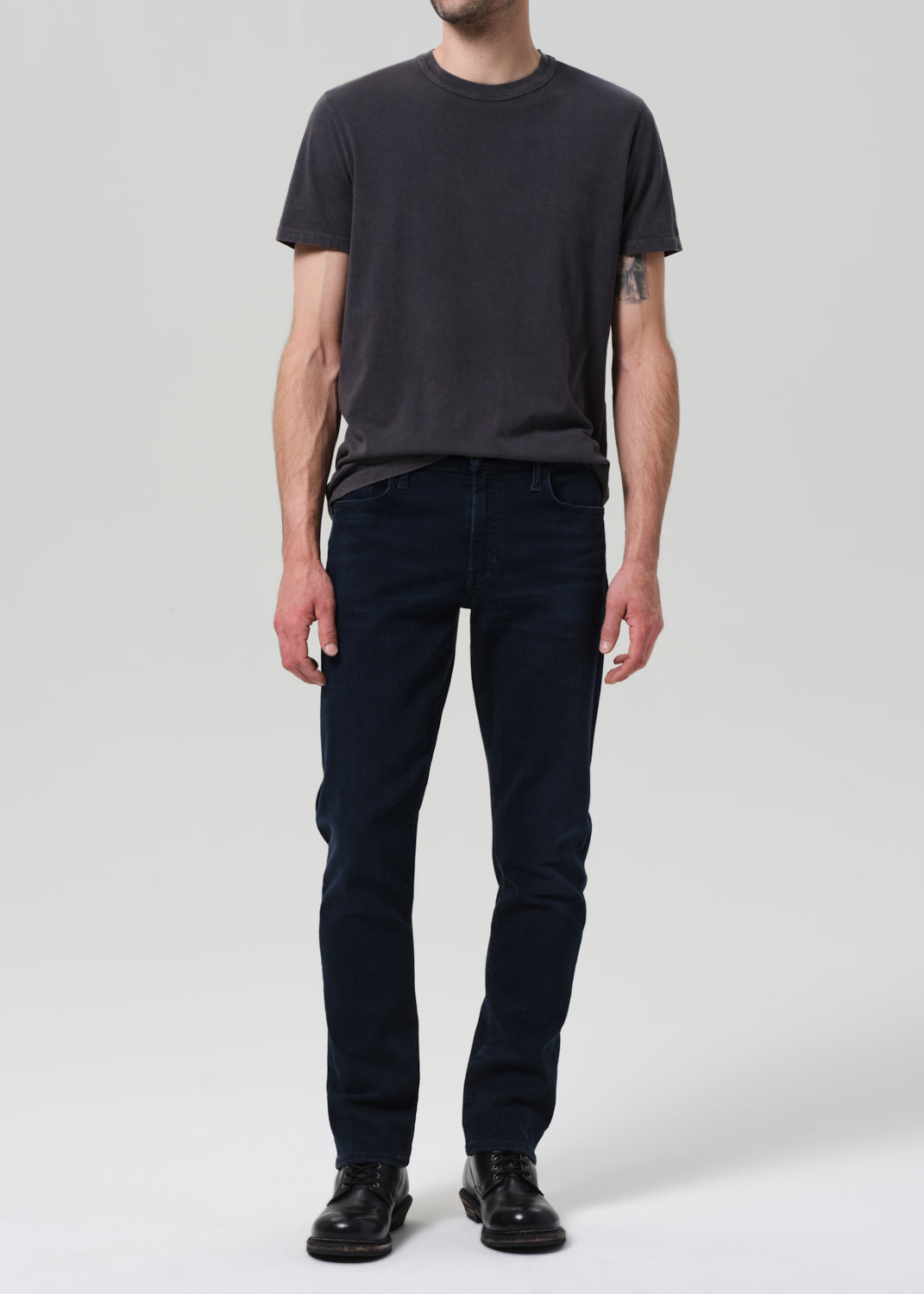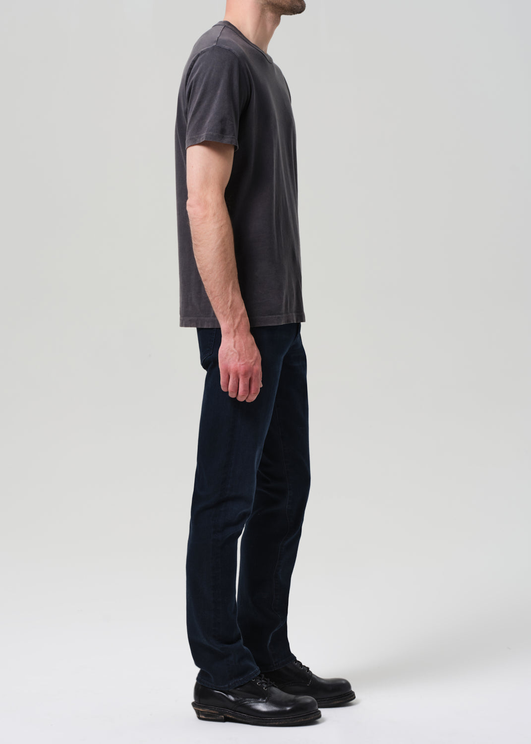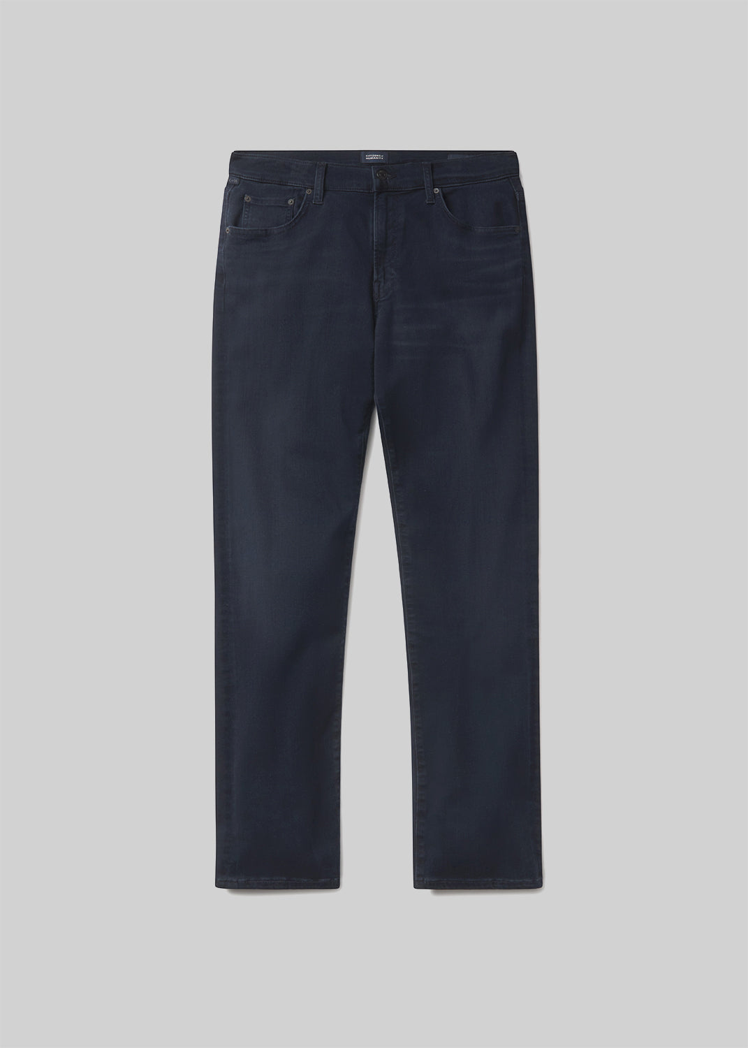 The Gage Classic Straight is a refined essential, cut from soft, lightweight stretch denim with a smooth, breathable feel. The silhouette is fuller through the hip and thigh, tapering below the knee for a clean, balanced shape. Hyde is a dark indigo wash with subtle whiskering and fading—versatile for everyday wear.