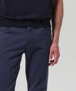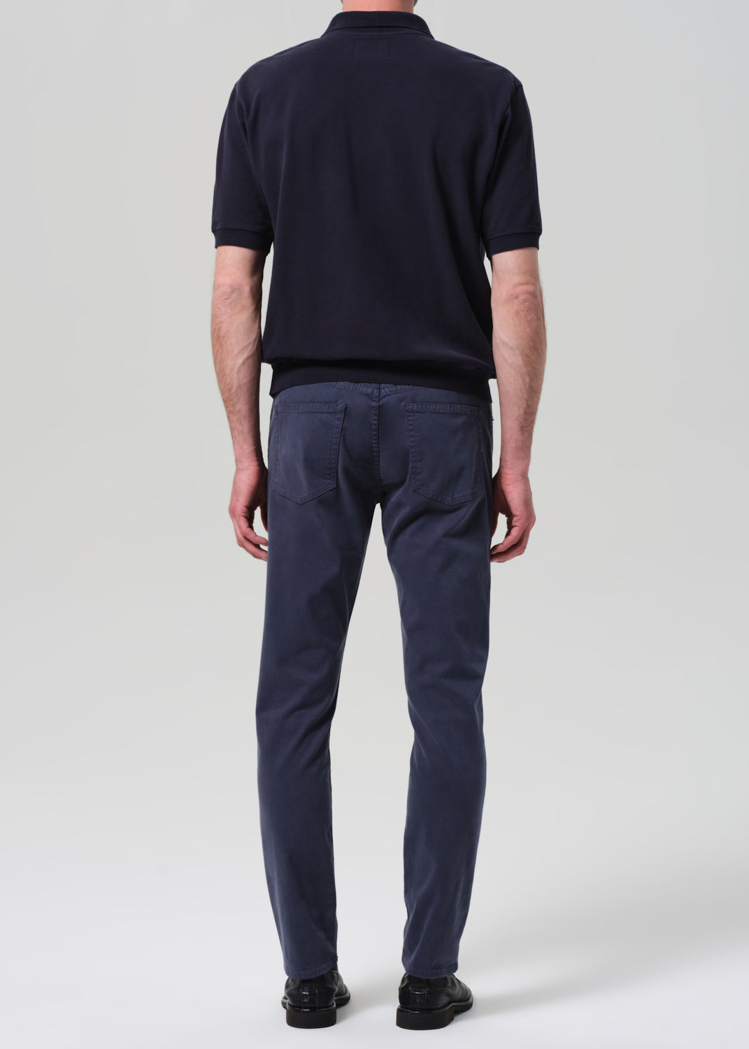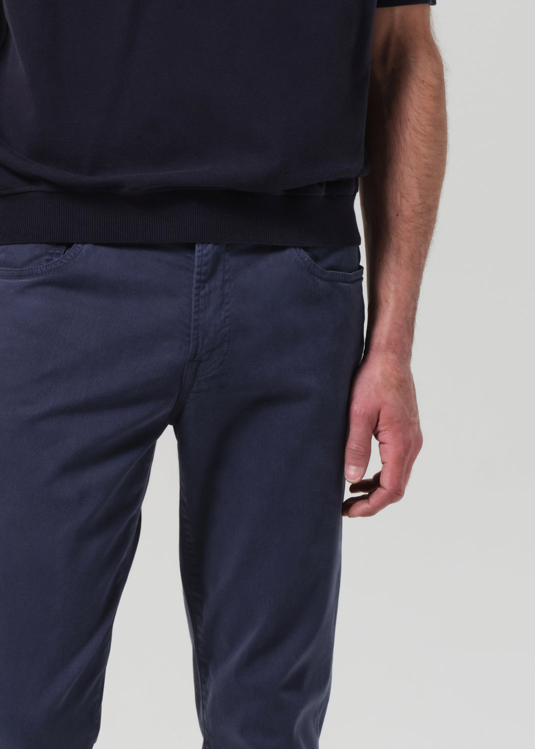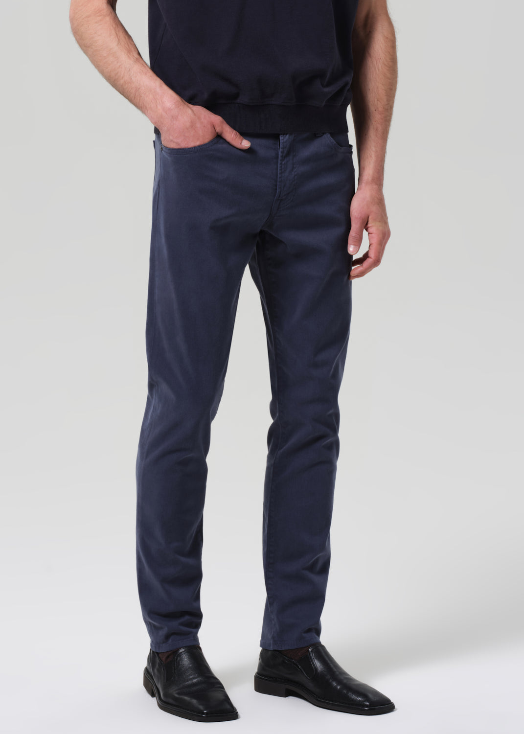 The ‘London’ is a modern slim taper, cut from breathable stretch sateen with a smooth, polished hand. Designed to sit fuller through the thigh and taper to the ankle, it offers a refined, versatile fit. The deep blue hue brings a crisp, elevated feel.
