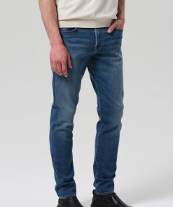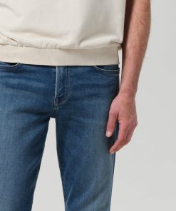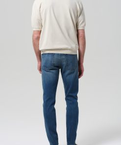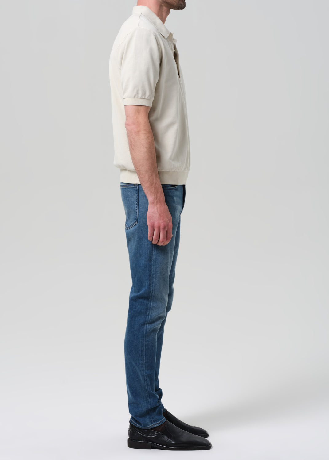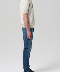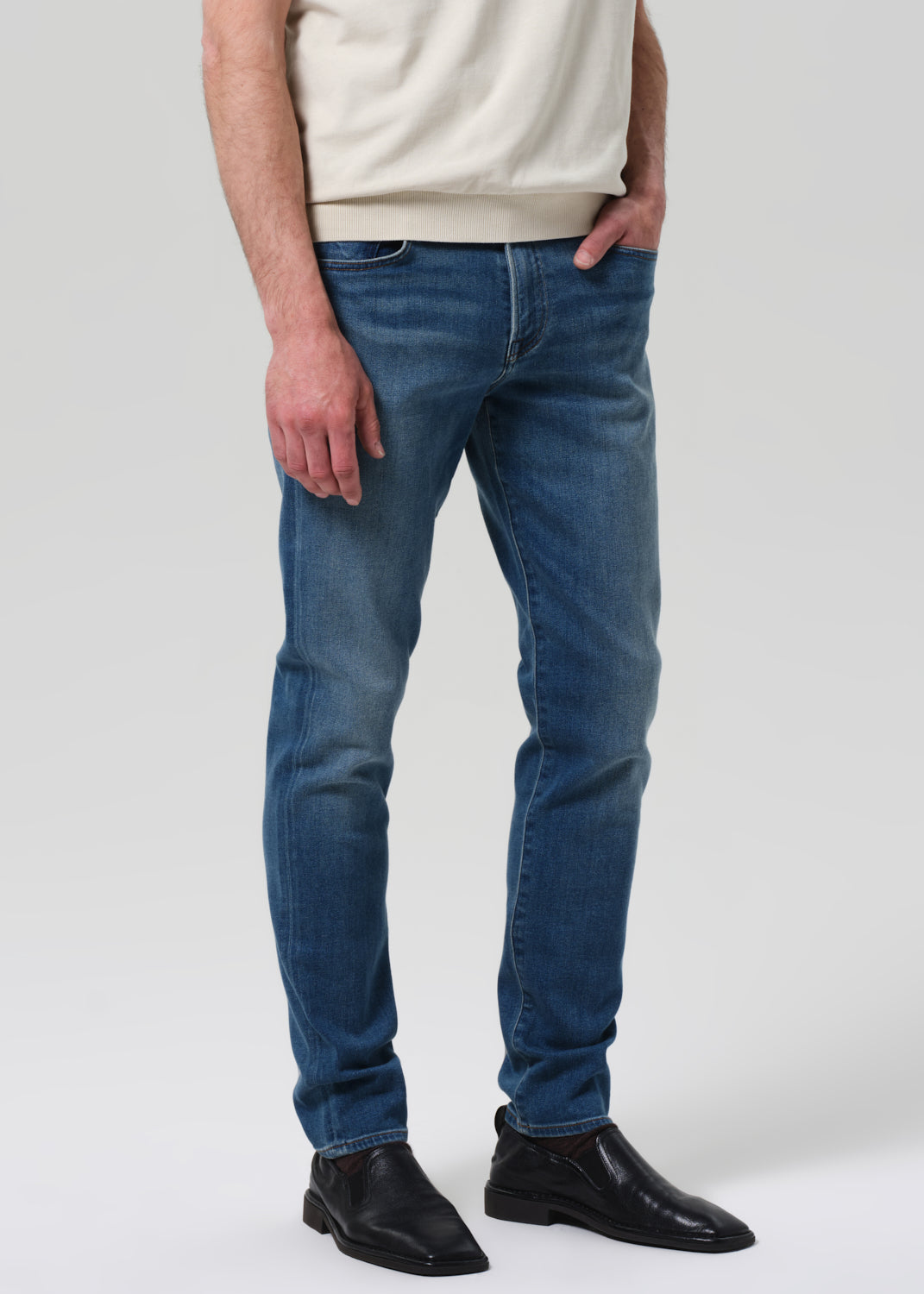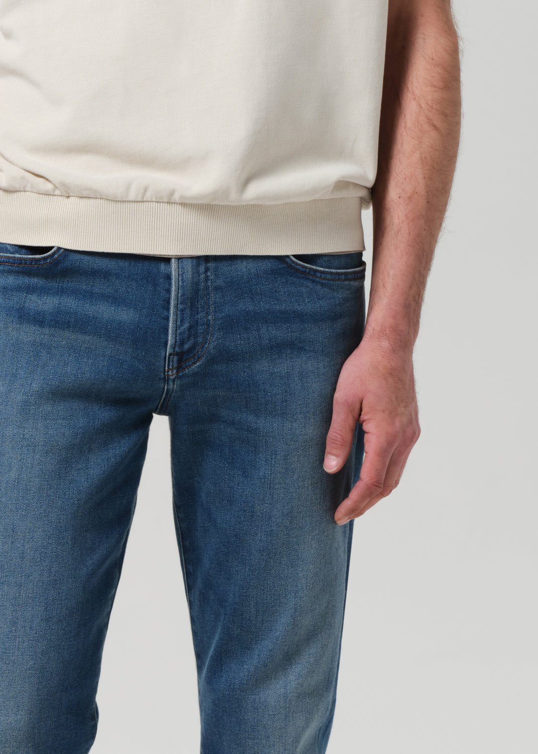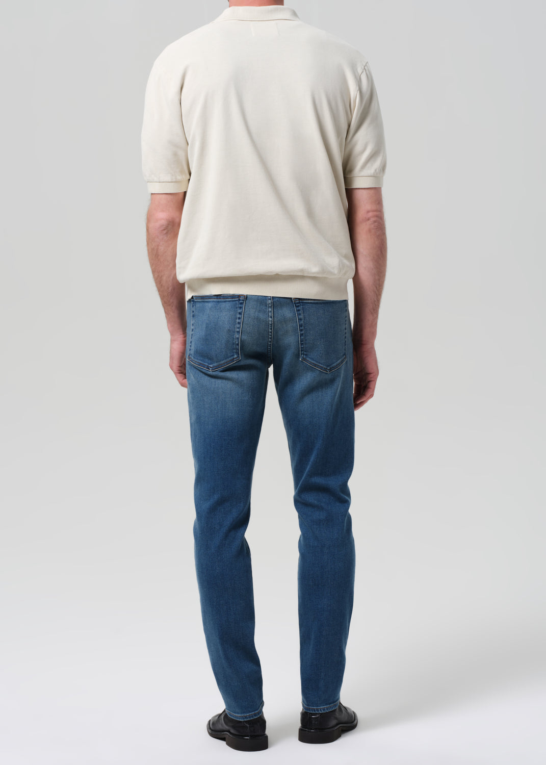 The ‘London’ is a modern slim taper, crafted from lightweight Perform denim with regenerative cotton for enhanced comfort and ease. The silhouette sits clean through the thigh and tapers below the knee for a streamlined shape. Avalon is a medium indigo wash with subtle fading and whiskering—perfect for everyday wear.