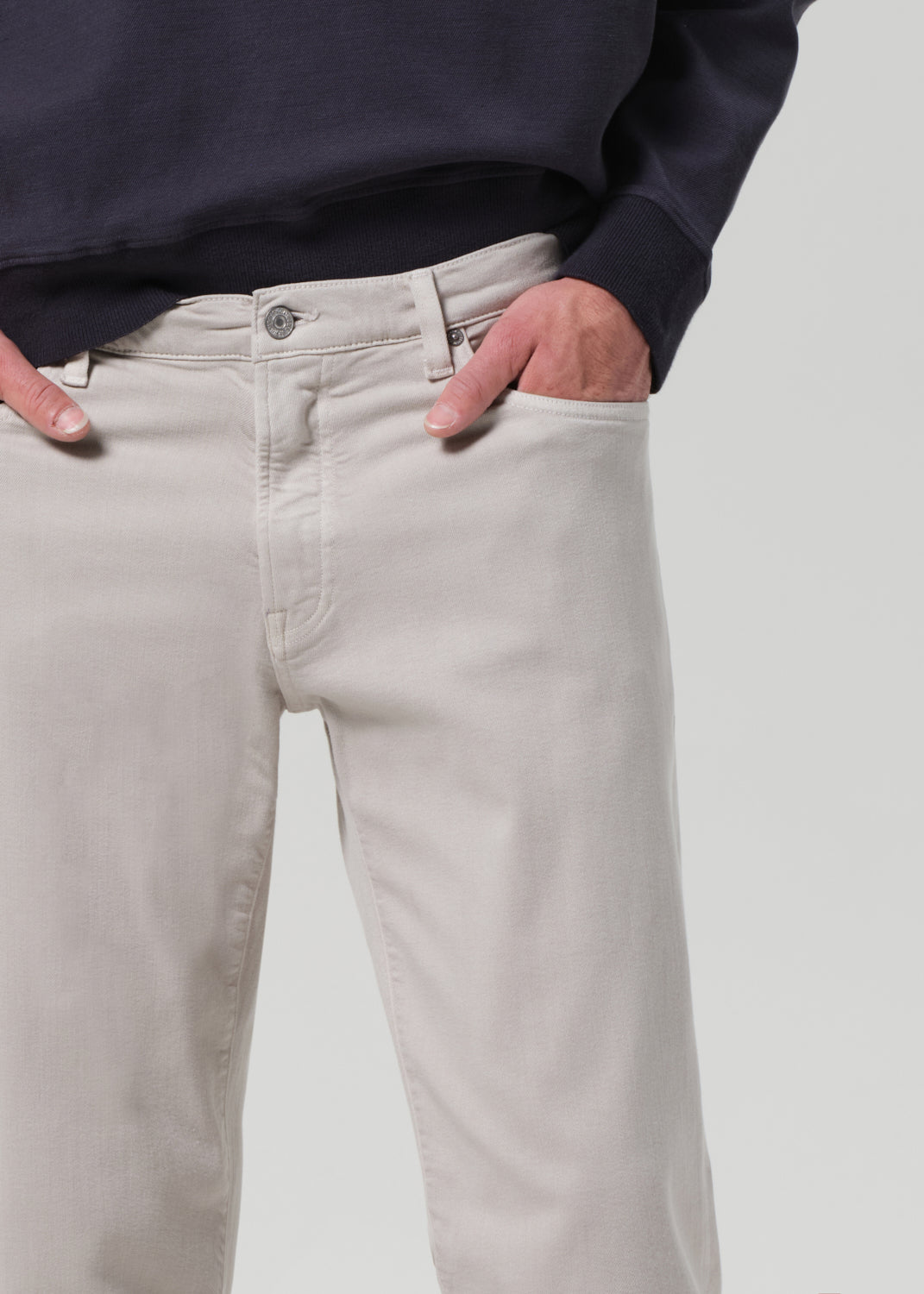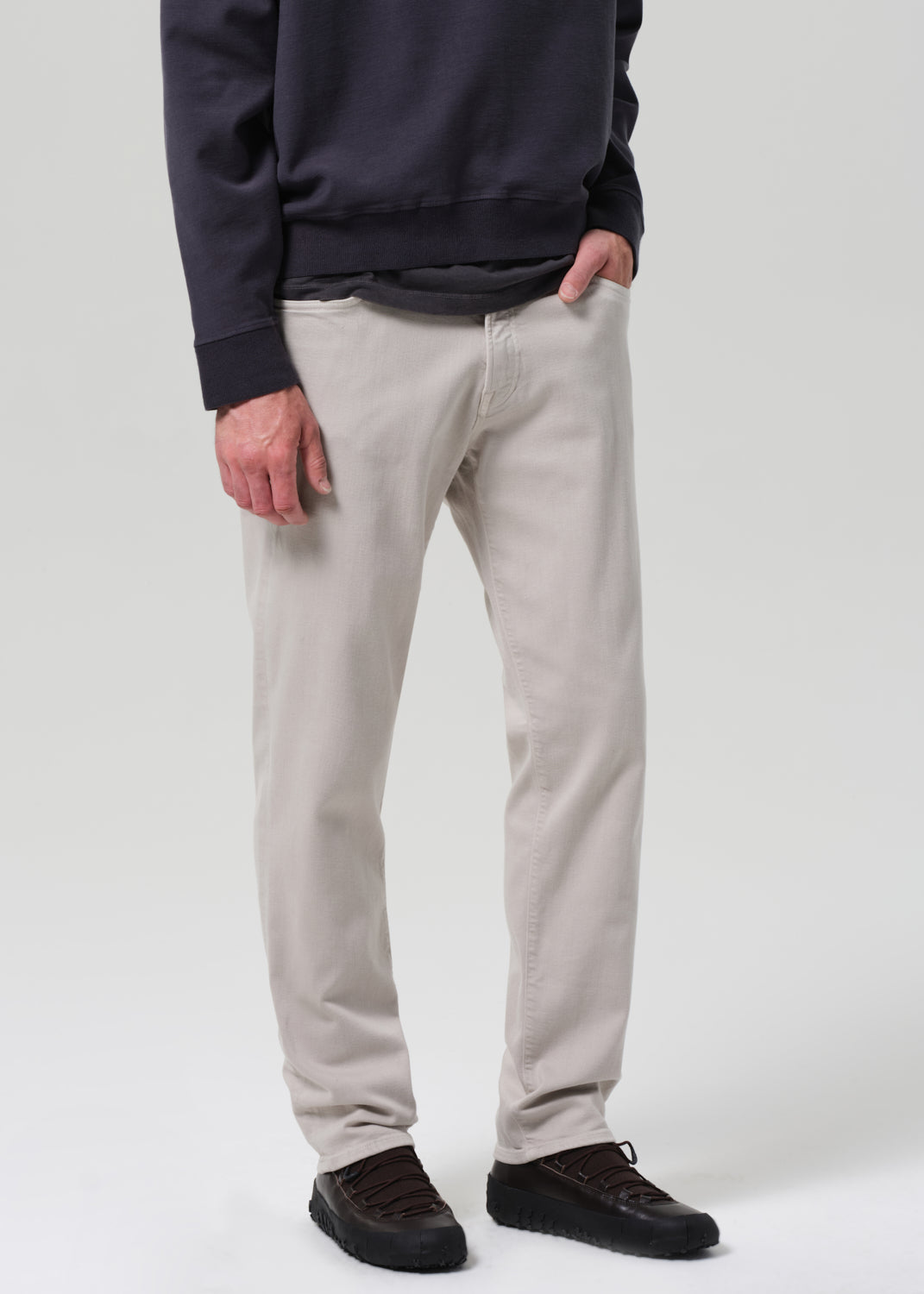The Adler is our slim straight fit, designed with a higher rise and an easy taper from knee to ankle. Crafted from breathable stretch twill with a soft, brushed feel, it’s finished in a pale gray that adds range to any wardrobe. Clean, considered, and built for daily wear.