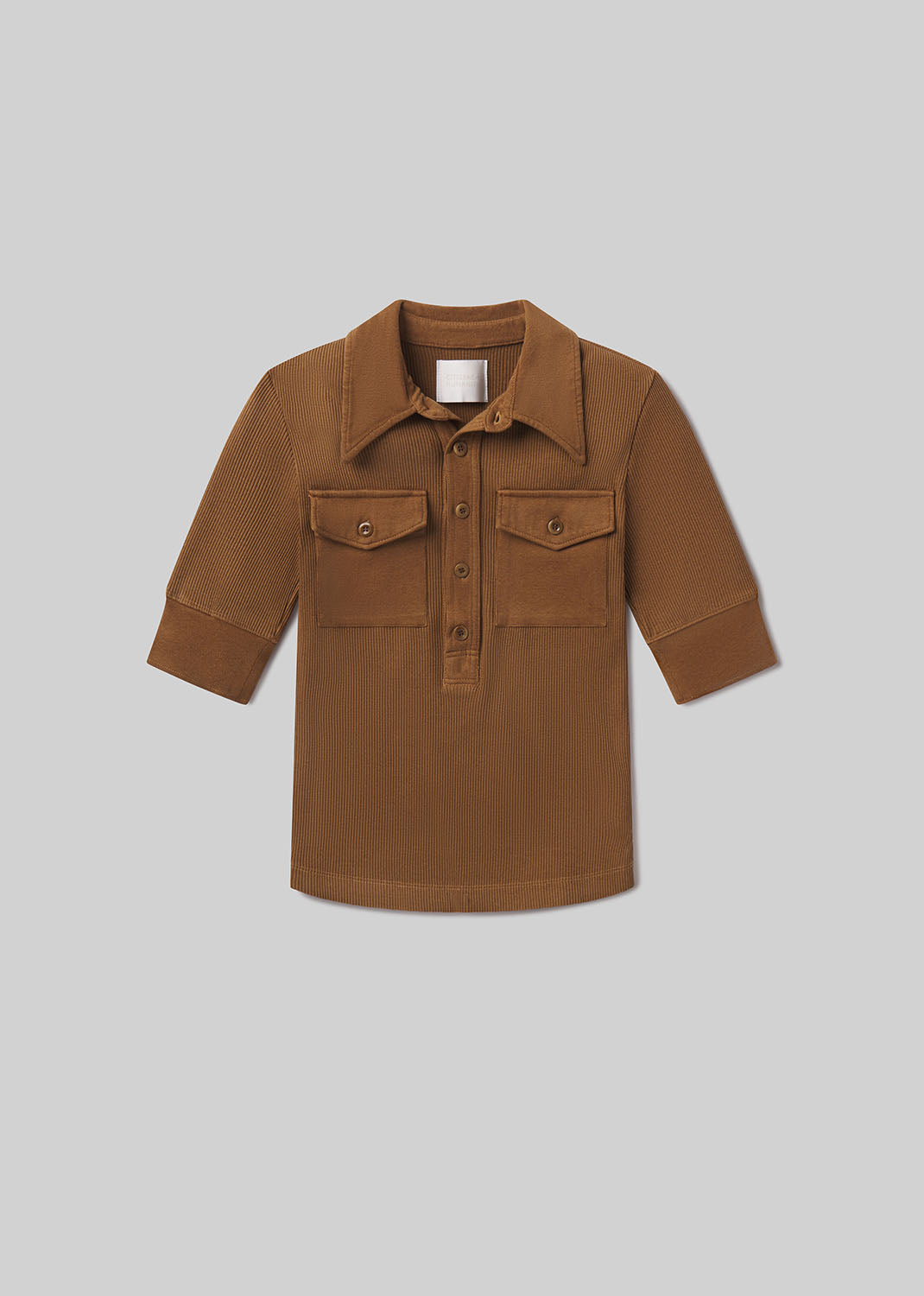 Looks Like: Medium to dark bronze elbow sleeve polo shirt with front pockets