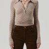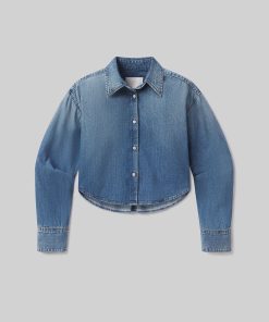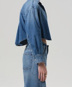 Looks Like: Medium indigo denim cropped long sleeve shirt with pointed collar