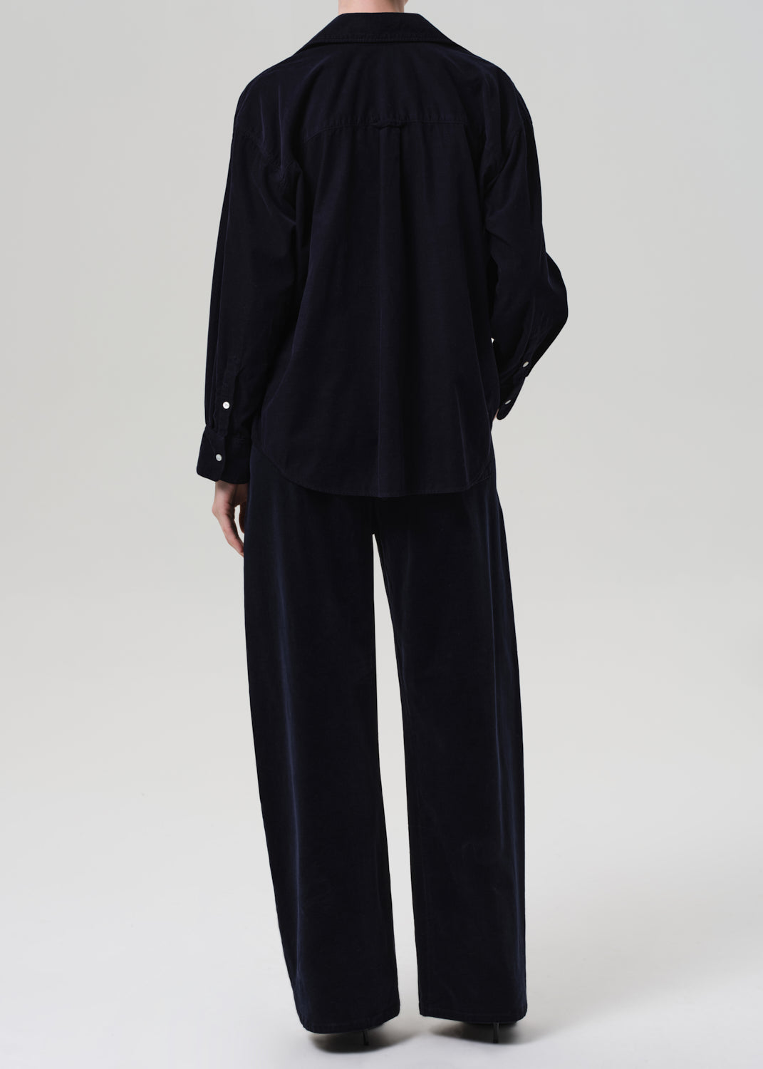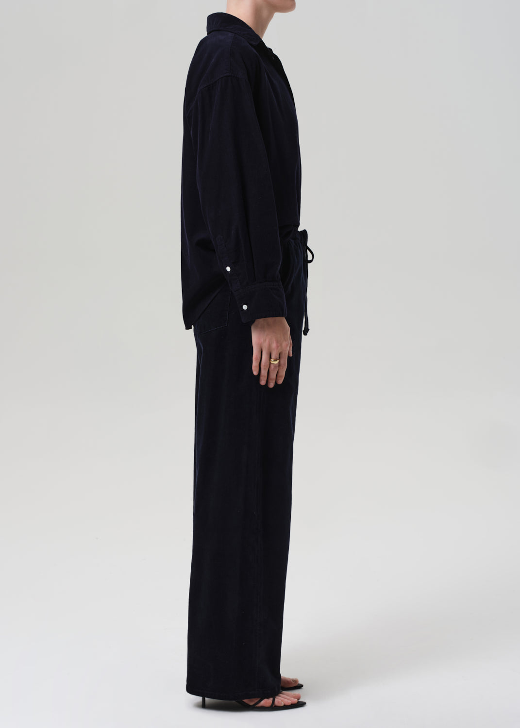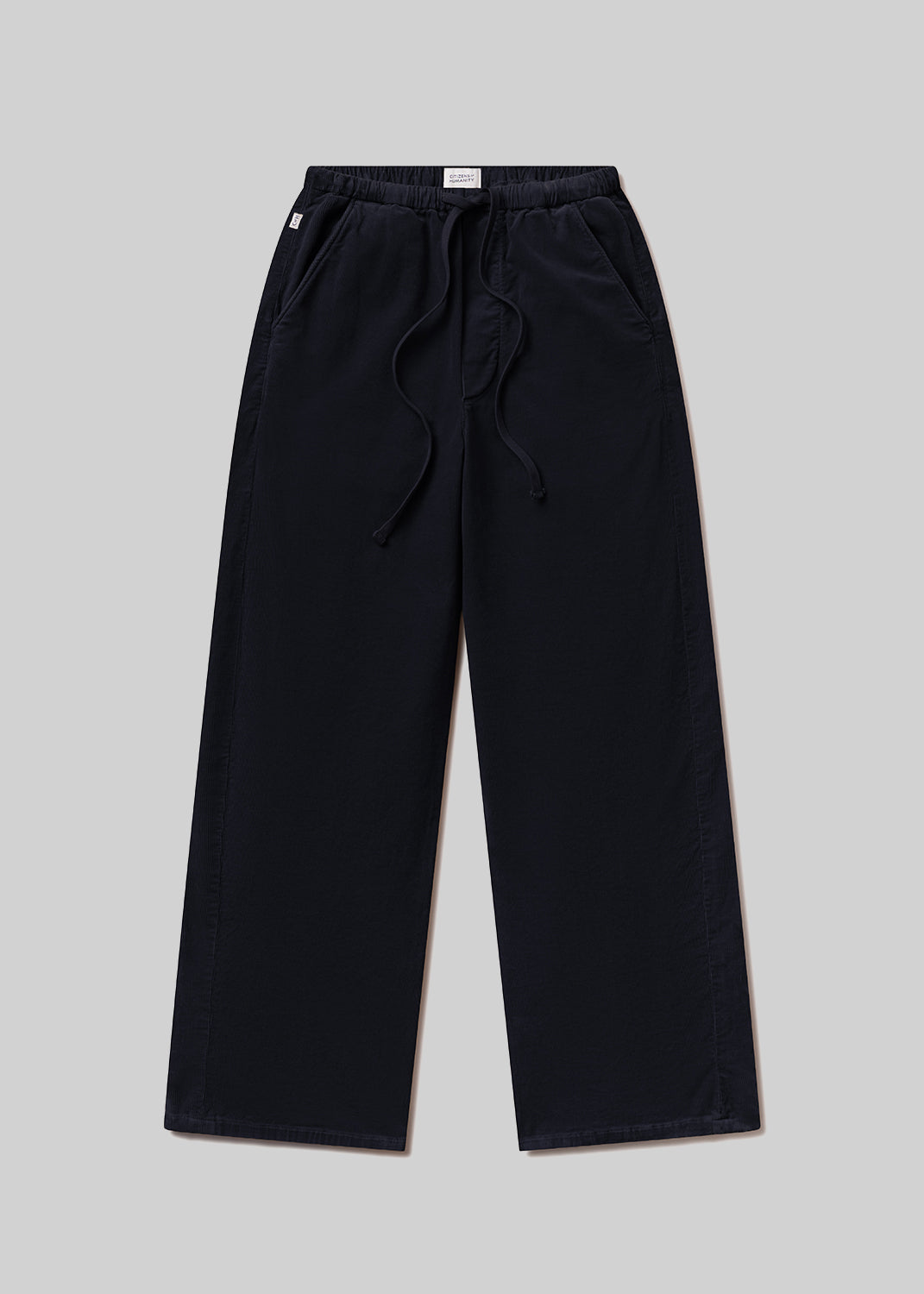 The ‘Aurora’ pant is crafted from soft, stretch baby corduroy with a finely textured finish and easy drape. Designed with a high-rise drawstring waist and wide leg, it blends comfort with quiet structure. The deep ‘True Navy’ hue offers a refined alternative to black—ideal with crisp shirting or tonal knits for everyday ease.