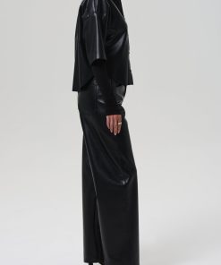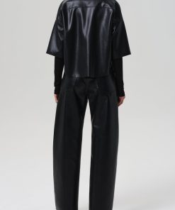 The ‘Ayla’ offers a refined take on the baggy silhouette with a relaxed fit that sits away from the body while maintaining a clean, intentional shape. This version is crafted from buttery recycled leather in a luxe black, finished with slight stretch for added ease. Style back to tonal leather shirting for a directional, head-to-toe look.