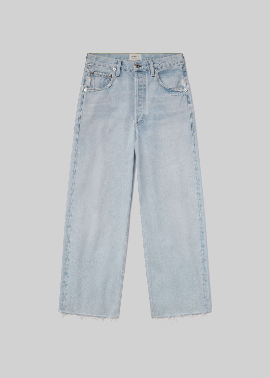 Looks Like: Light indigo denim with fading, whiskering and raw hem