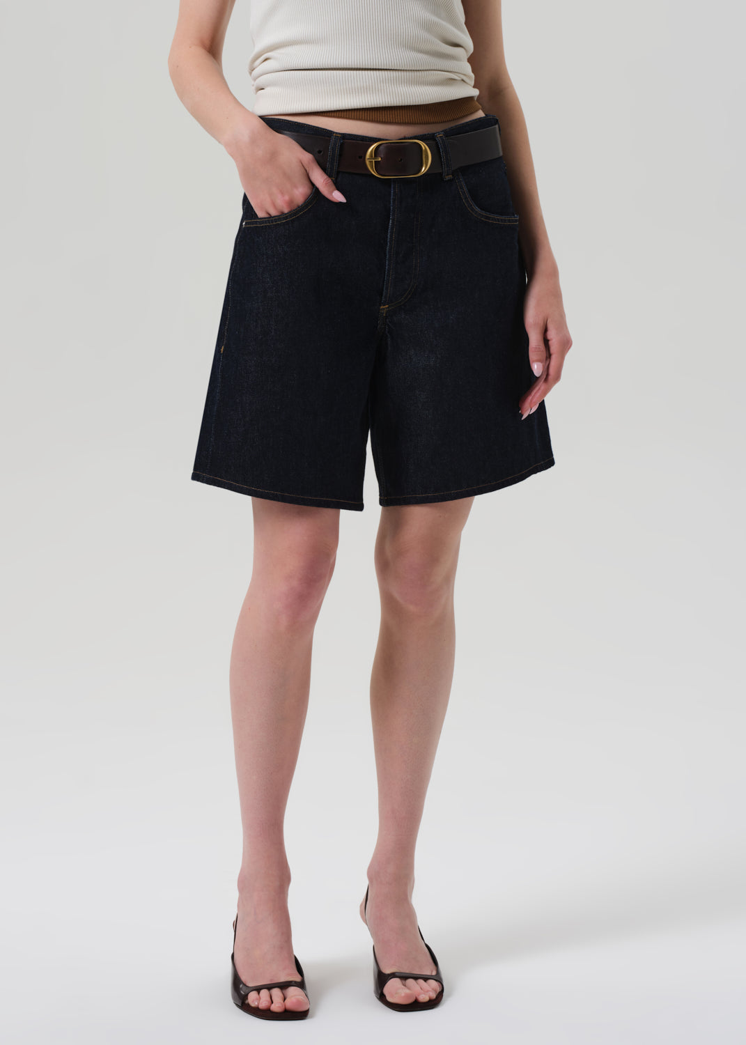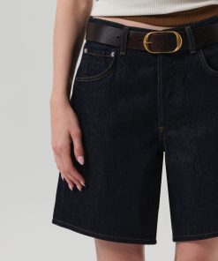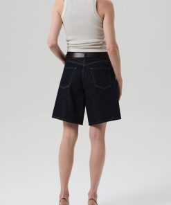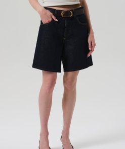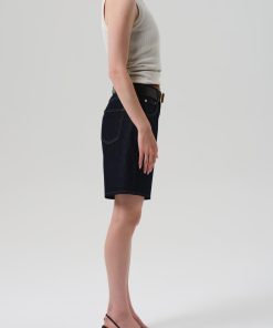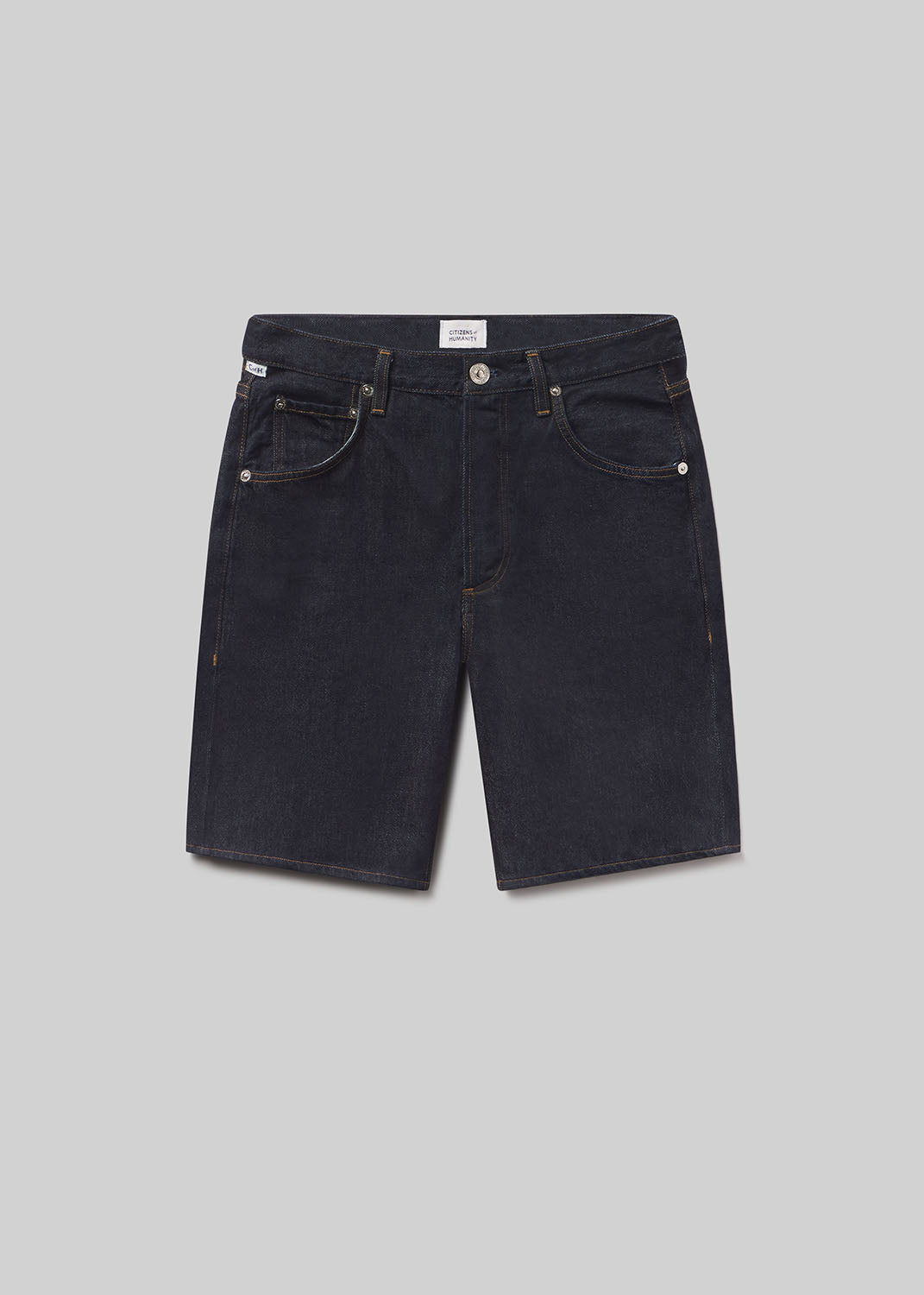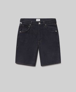 Looks Like: Clean deep dark to medium indigo denim short with clean hem