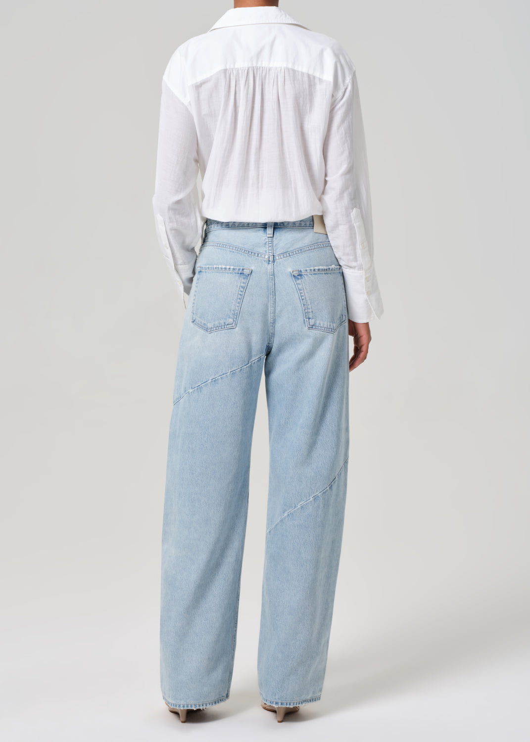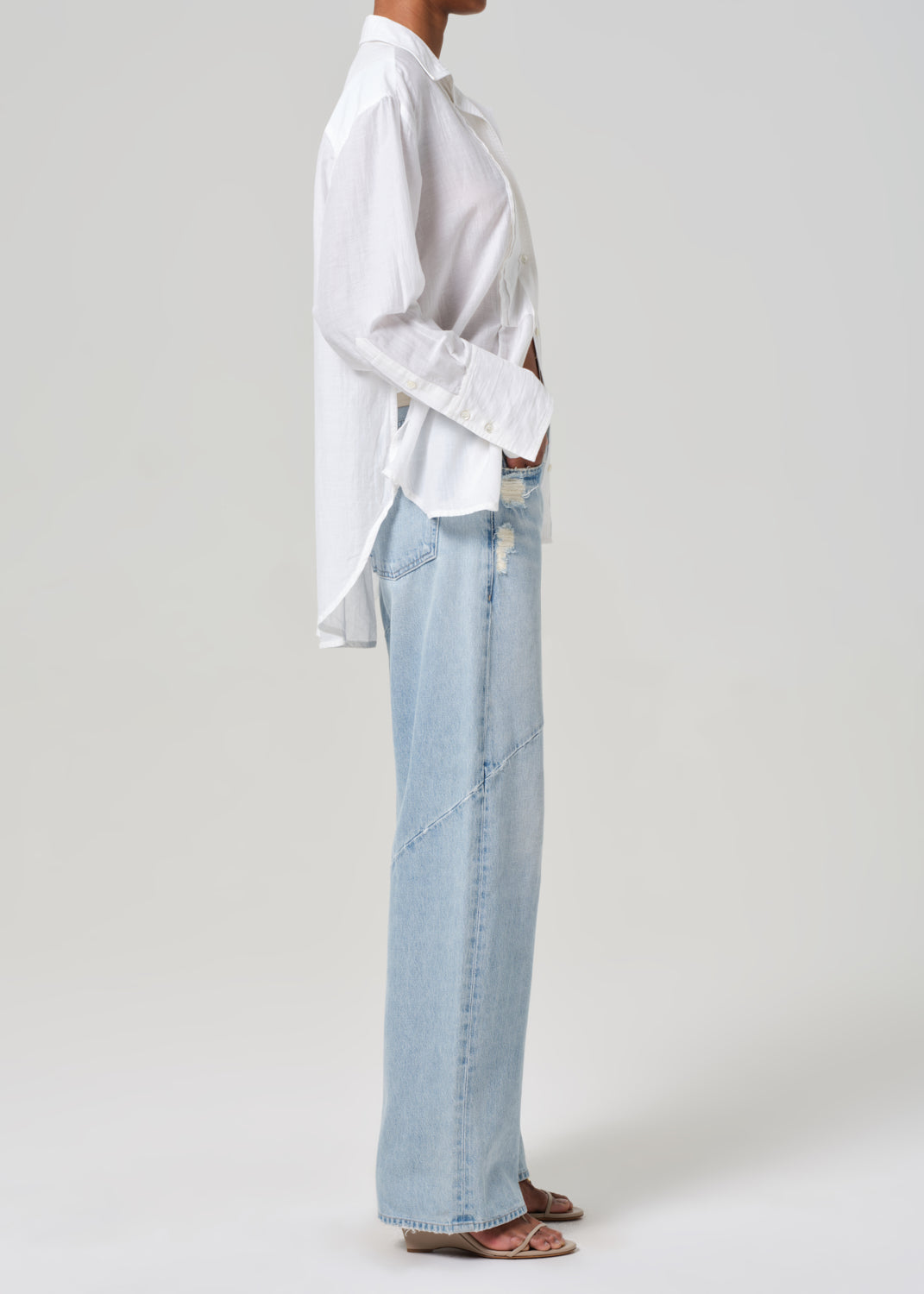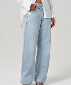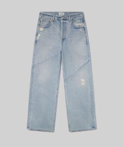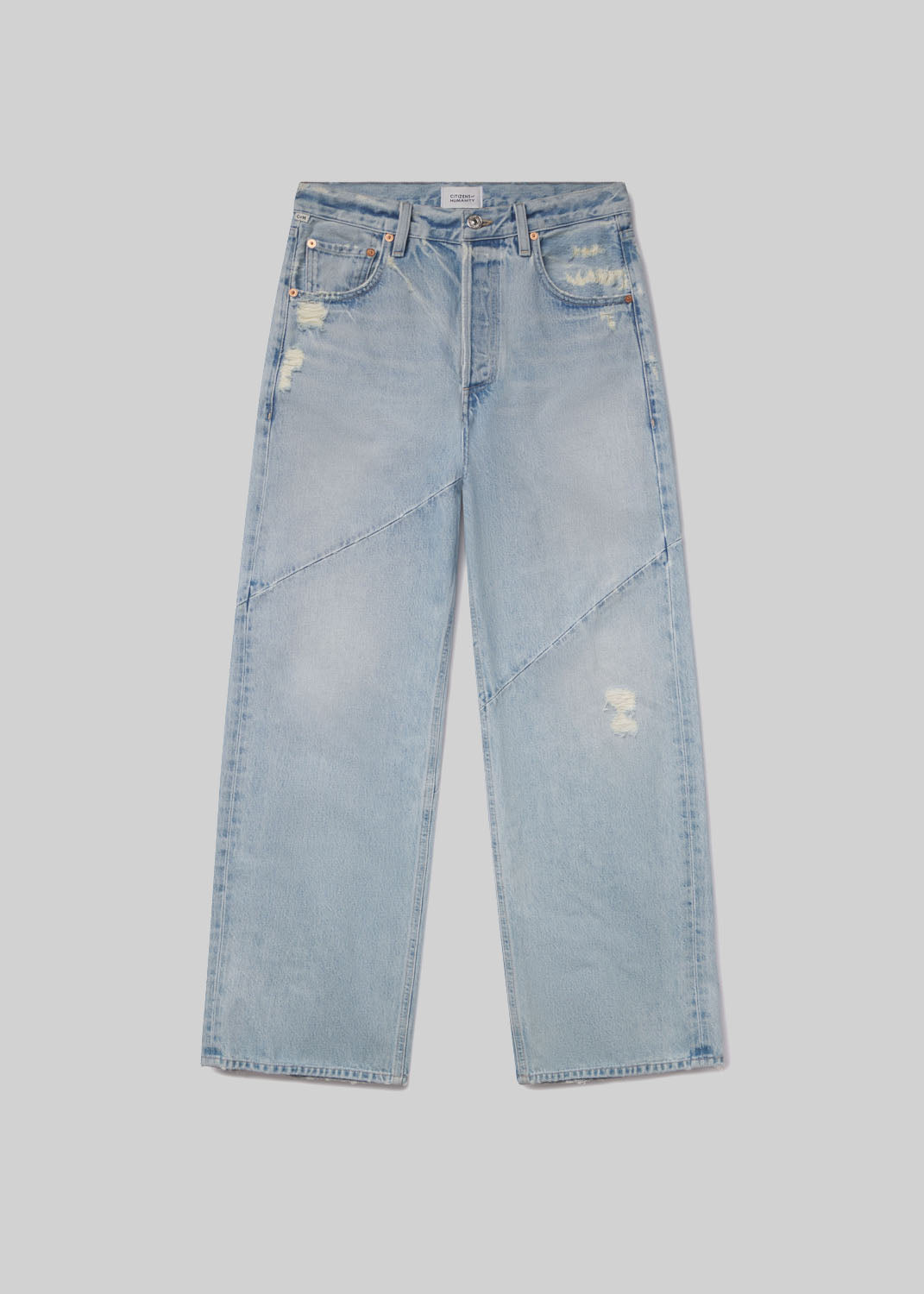 Looks Like: Light indigo denim with distressing and seam detailing