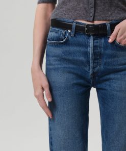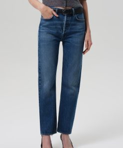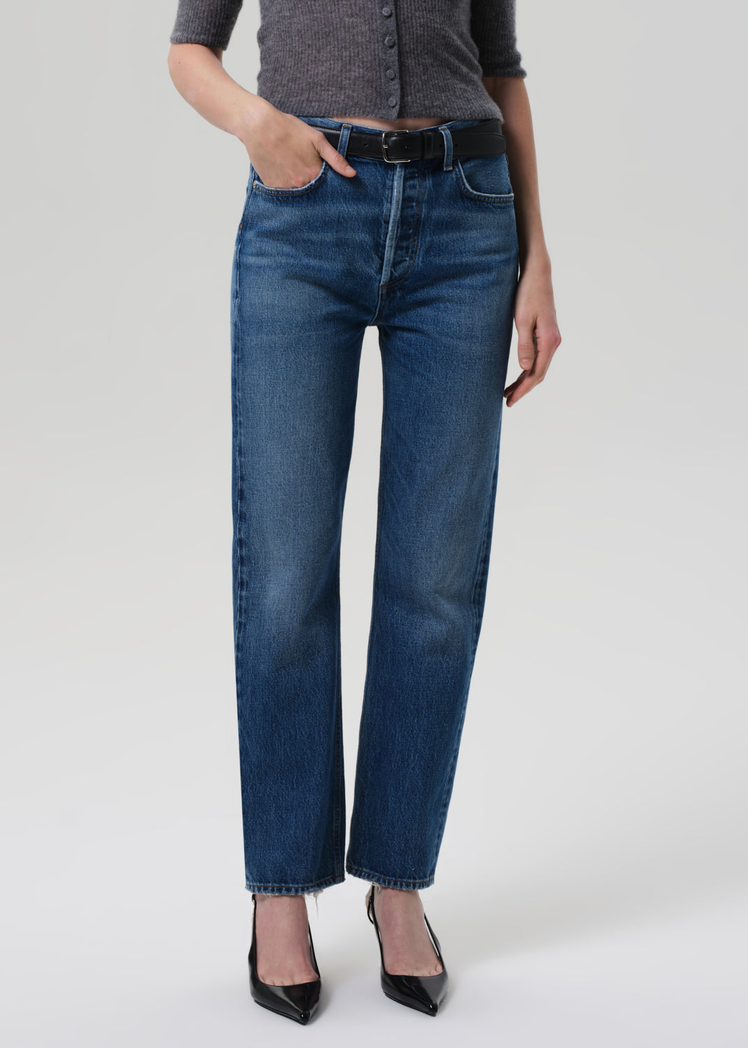 The ‘Blaine’ is a vintage-inspired straight leg with a high rise and ankle-length inseam for a flattering, clean-lined silhouette. The ‘Chaya’ wash is a softly worn medium-light indigo with subtle fading, marbling, and whiskering. Crafted from rigid regenerative cotton with a soft hand, it’s an everyday essential—style with a slim tee or oversized blazer for effortless contrast.