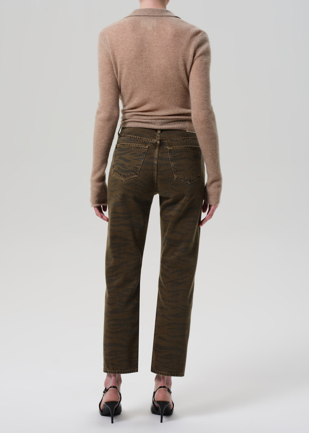 Looks Like: Brown denim pant with zebra print