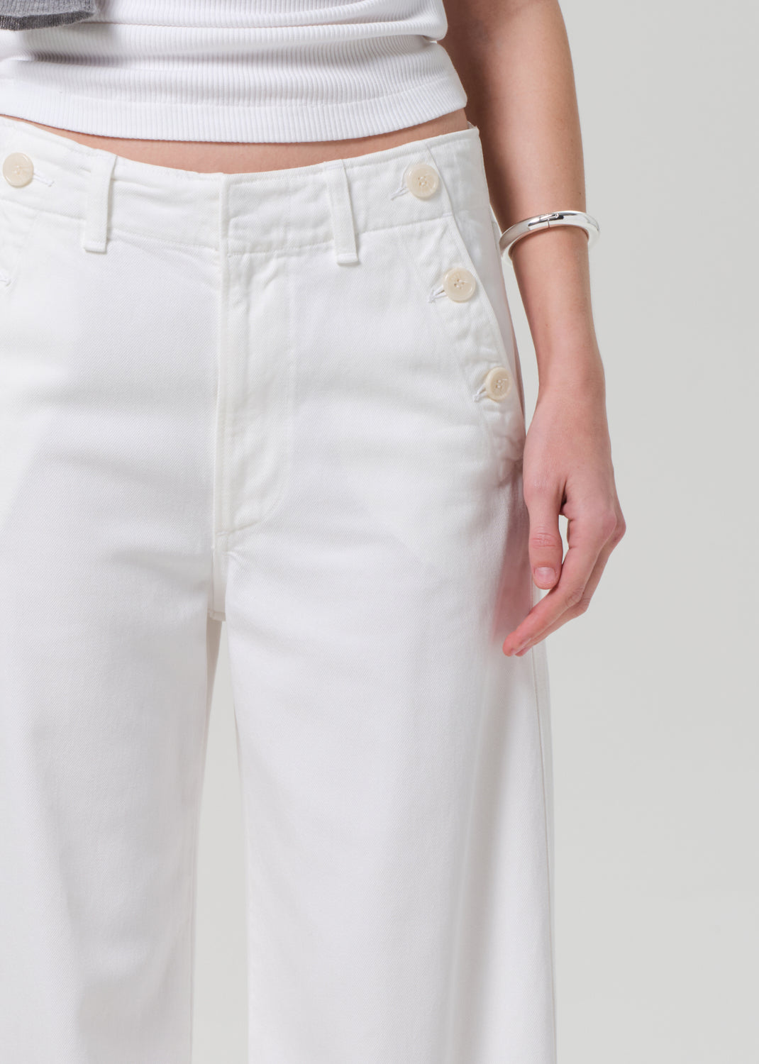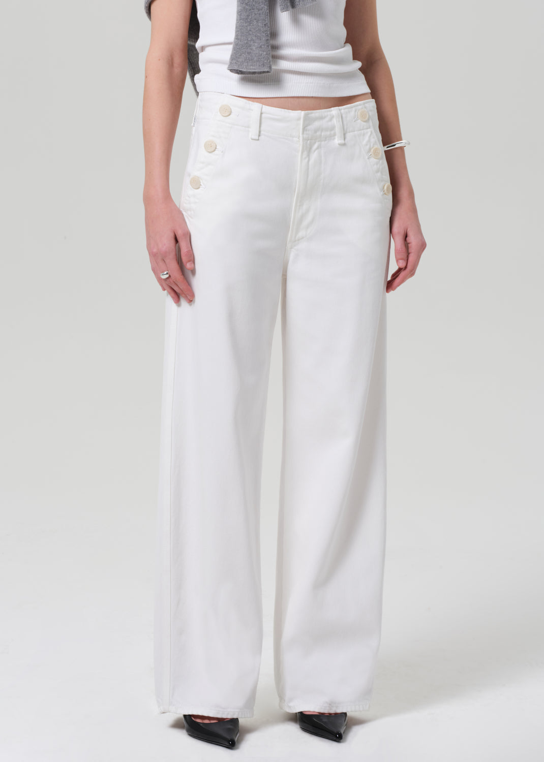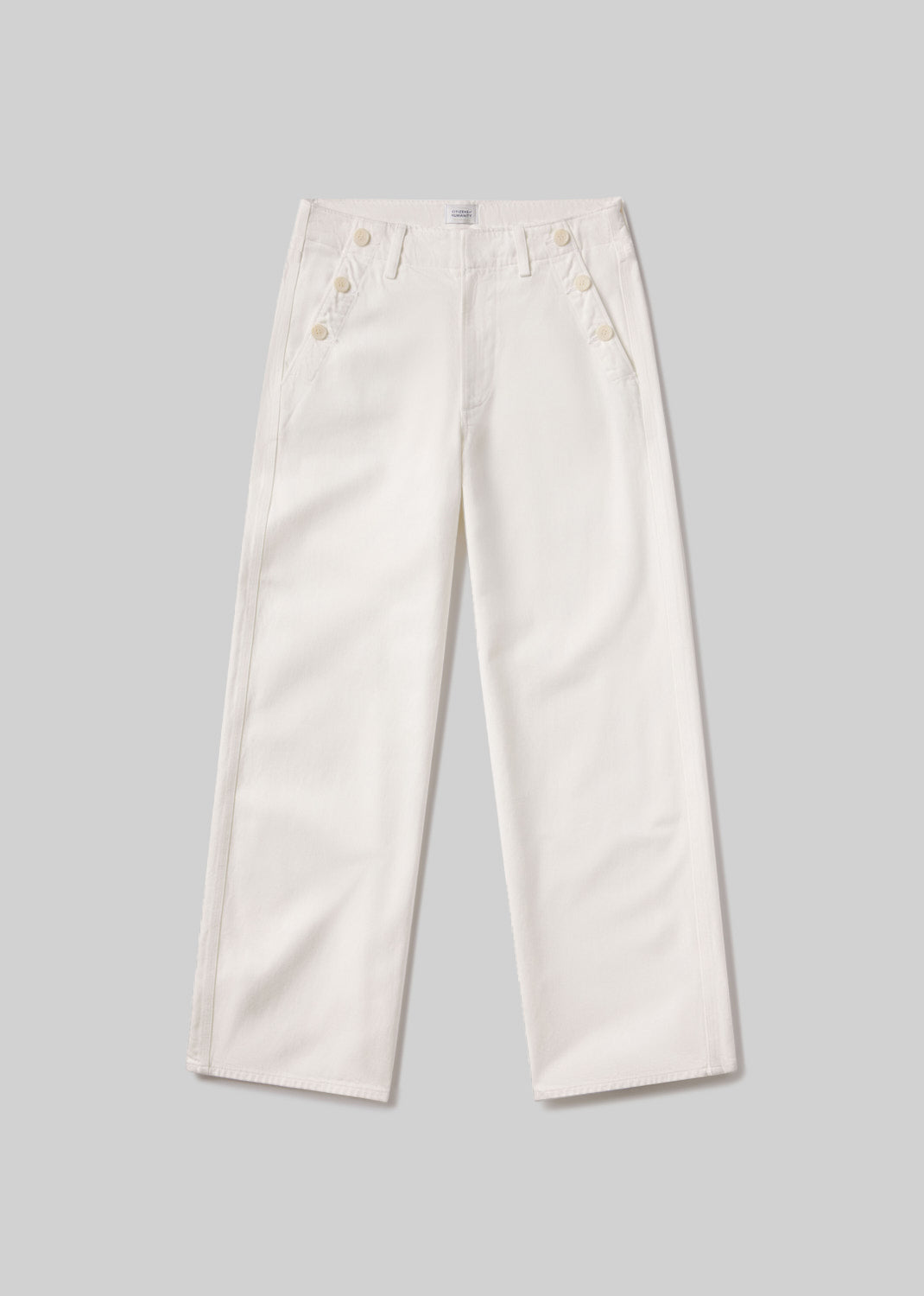 The Boardwalk Trouser draws inspiration from classic nautical styling with its signature button placement and sailor pant silhouette. The flowy, billowy leg offers an easy, relaxed fit that feels both effortless and sophisticated. Crafted from crisp white denim, this piece is perfect for styling with tonal separates for a chic, monochromatic look that’s as elevated as it is laid-back. A versatile addition to any summer wardrobe.