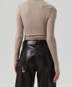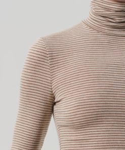 Looks Like: Beige and brown striped long sleeve turtleneck shirt
