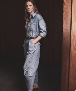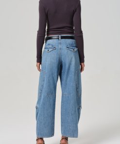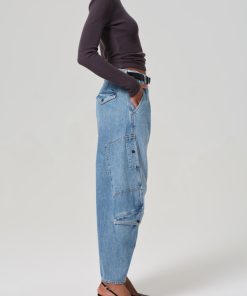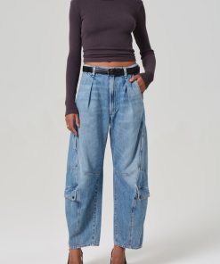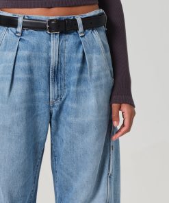 Vintage-inspired utility fit with a pleated waist and barrel leg silhouette.