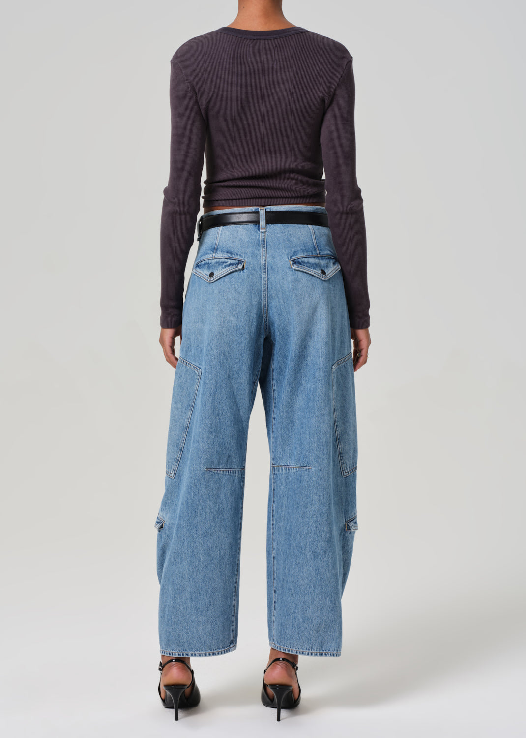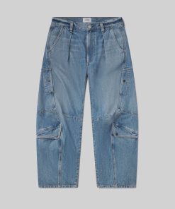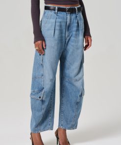 Looks Like: Light to medium indigo cargo pant with pleat detailing and side pockets