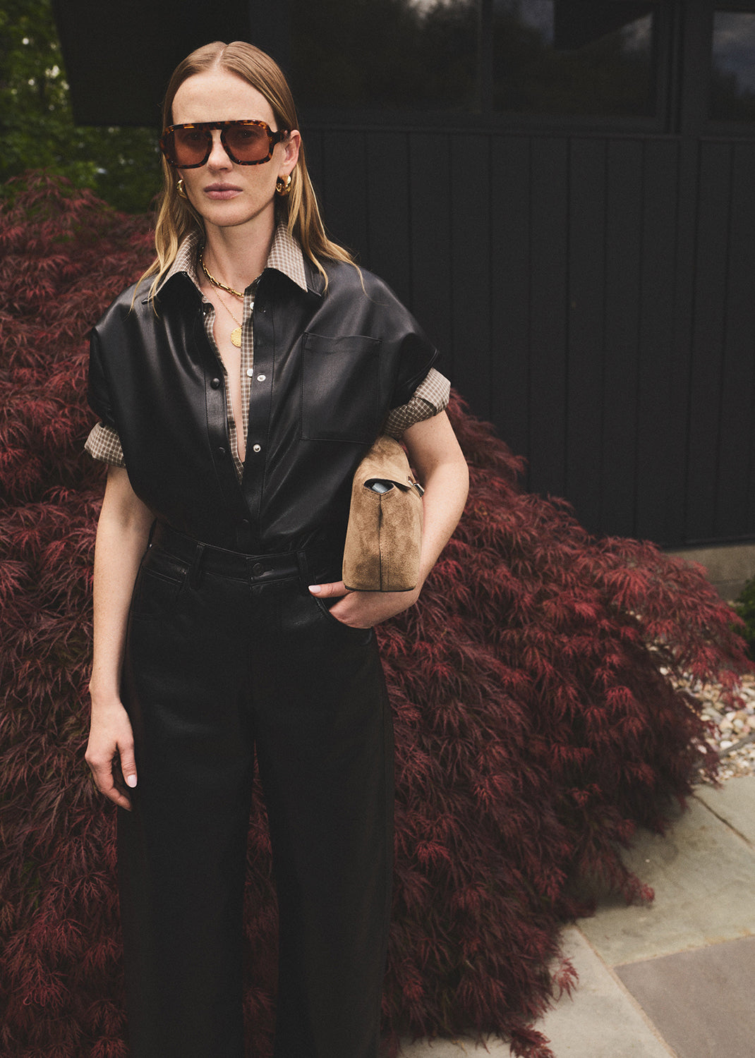 The ‘Frances’ offers a directional take on the classic button-up, reimagined in buttery recycled leather with a subtle stretch for ease. Designed with a cropped silhouette and cape-inspired back detail, it balances sharp structure with modern edge. A bold staple—perfect styled with high-rise denim or tailored trousers.