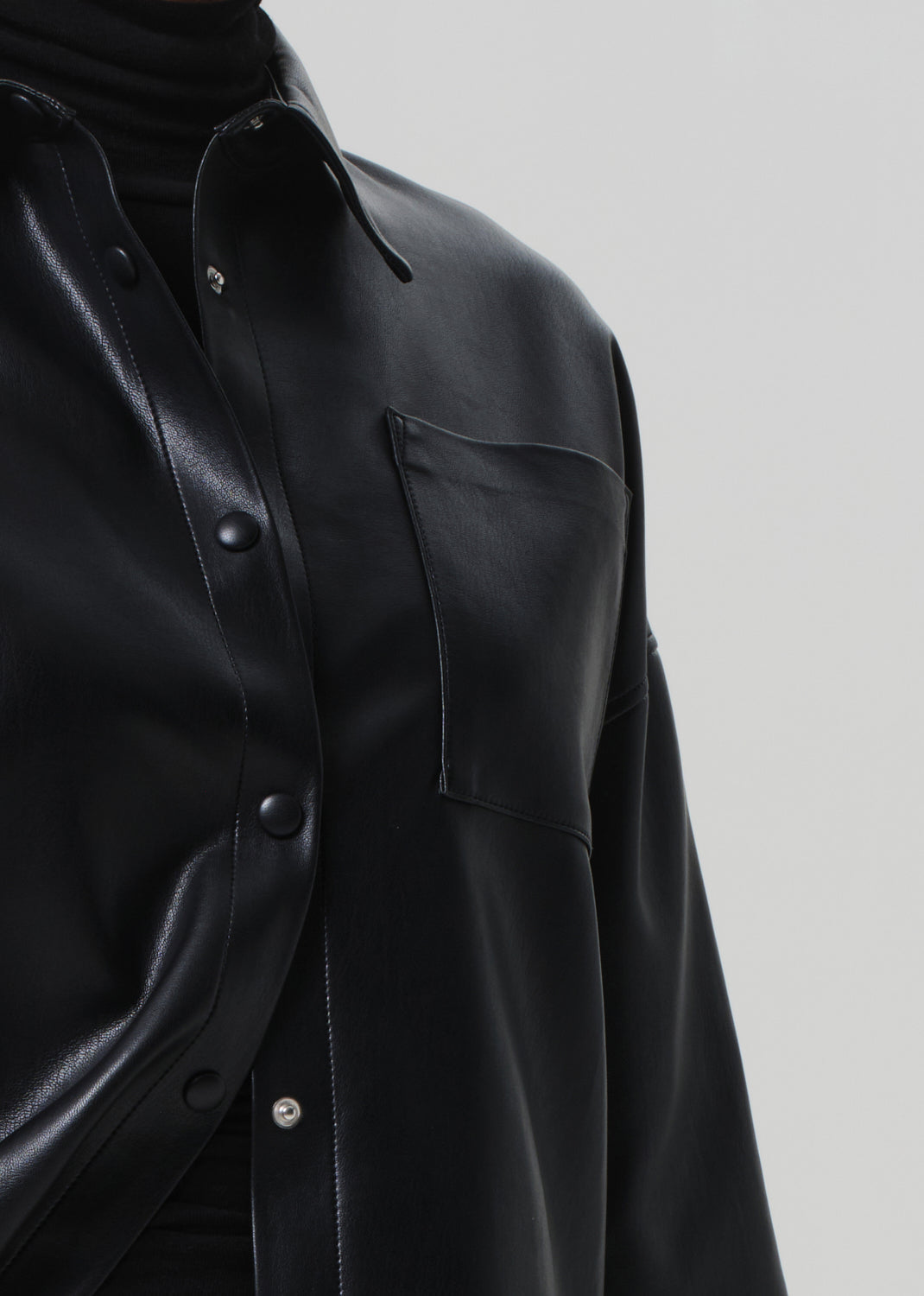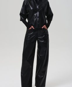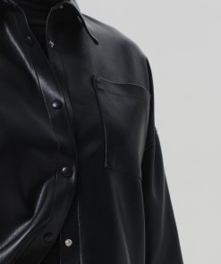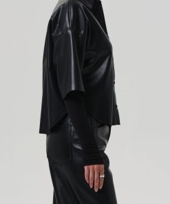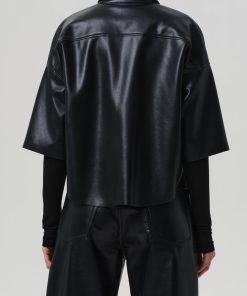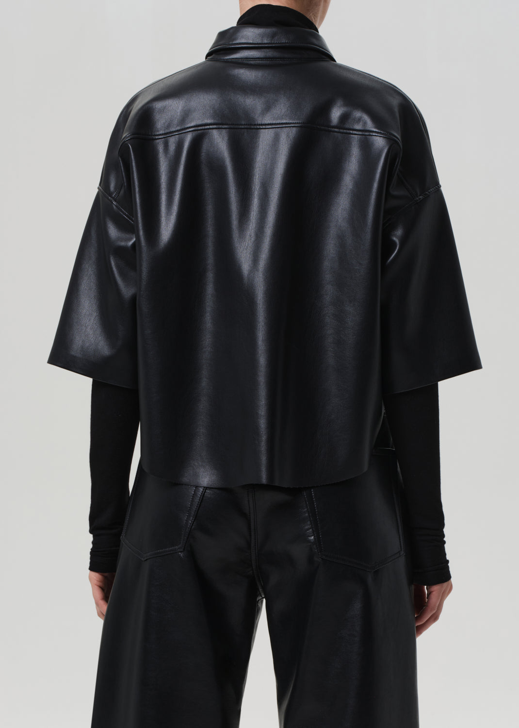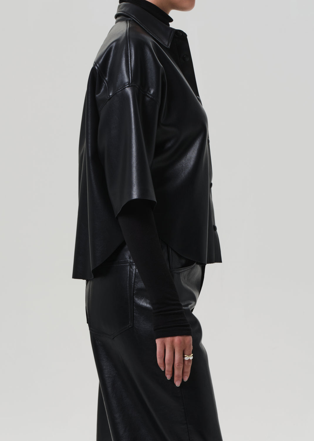 Looks Like: Luxurious black leather cropped button front short sleeve shirt