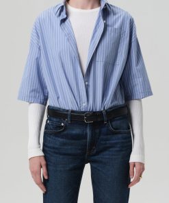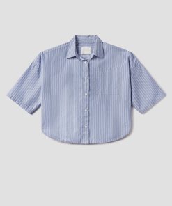 Looks Like: Medium and light blue striped cropped short sleeve button up shirt