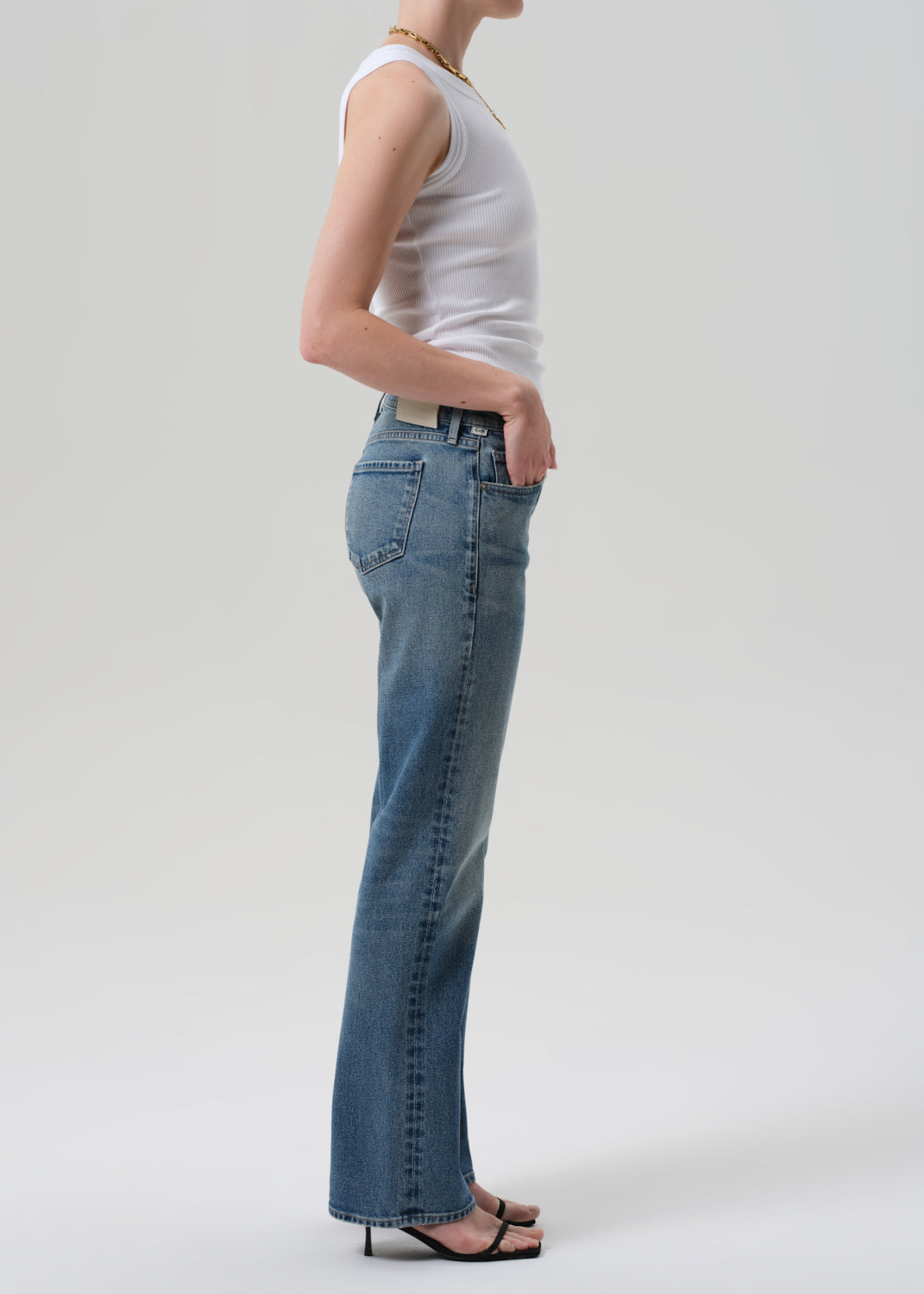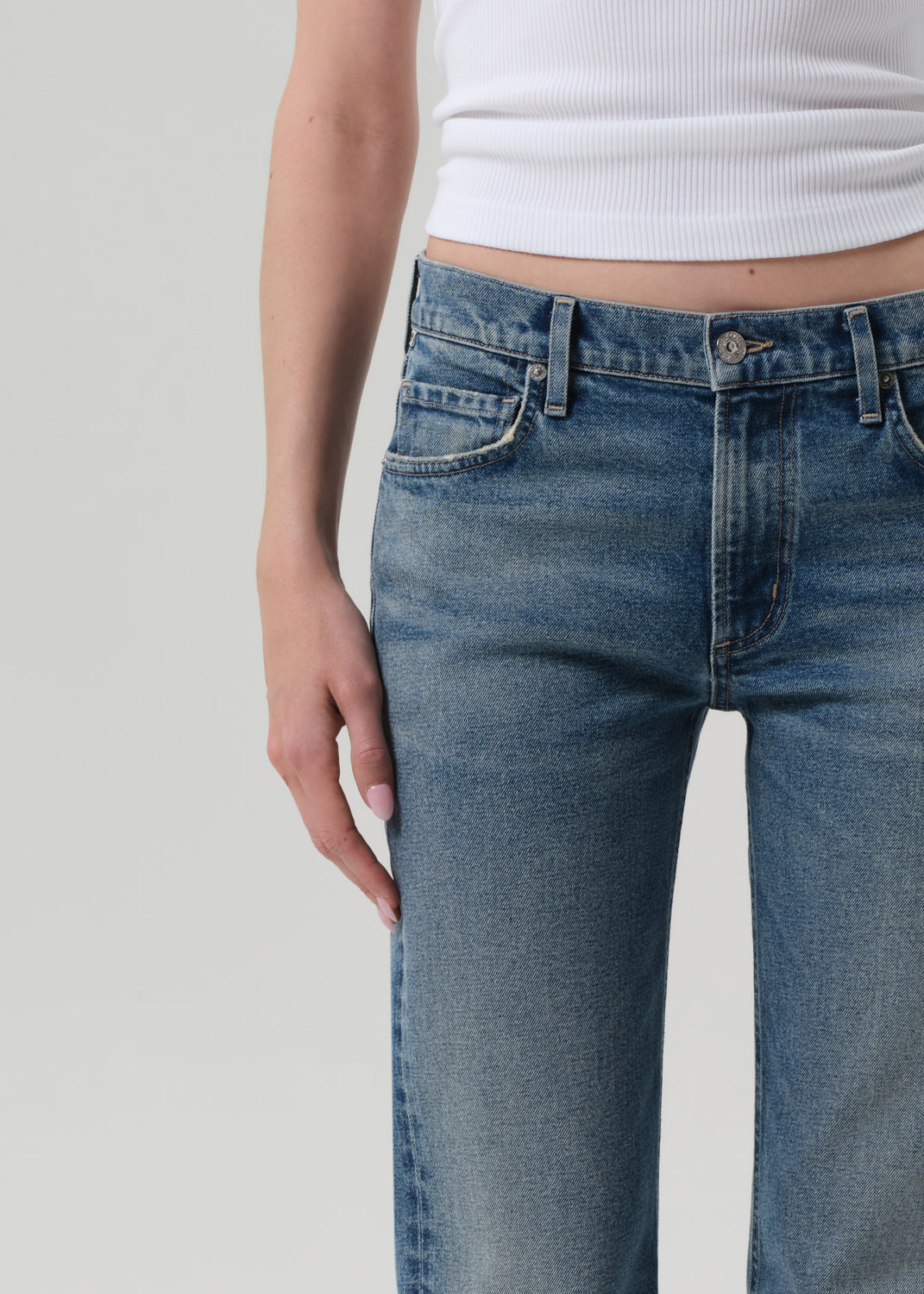 The Genova is a low-rise bootcut silhouette designed to elongate and flatter. Crafted from Japanese comfort stretch denim with a soft, broken-in hand, it offers structure with subtle flexibility. The Clairo wash—a medium indigo with gentle fading and whiskering—adds a timeless, lived-in finish. The versatile full-length leg pairs effortlessly with any kind of shoe—from boots to sneakers to heels.