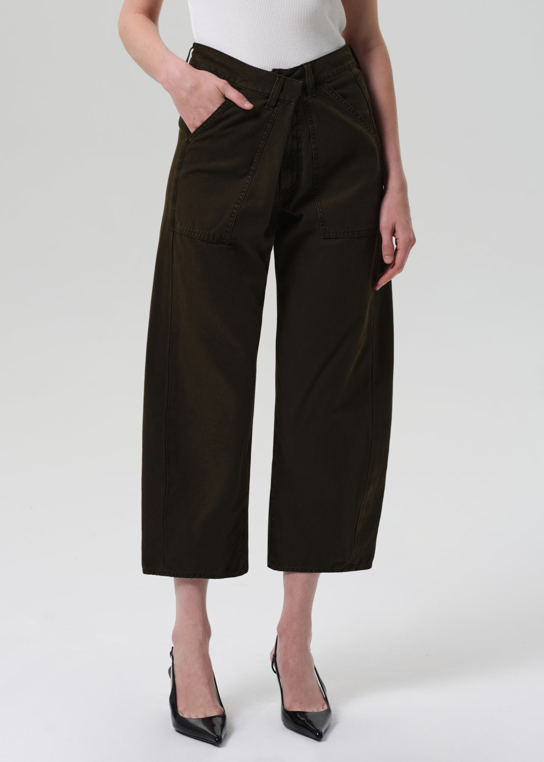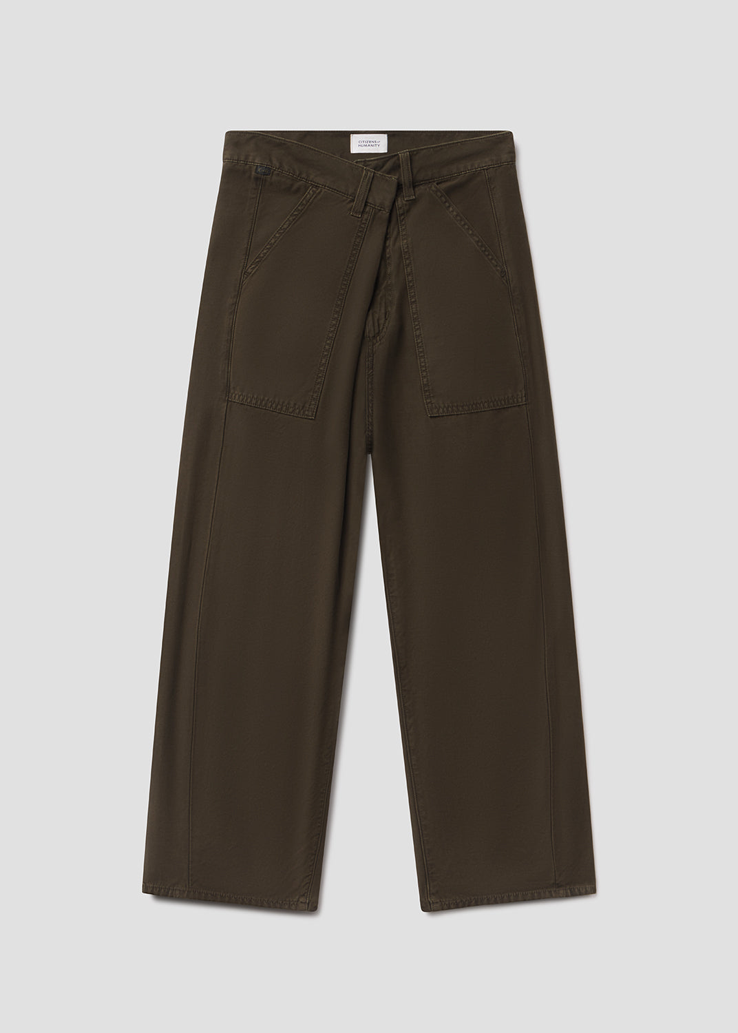Looks Like: Dark green trouser with fold front closure and utility pockets