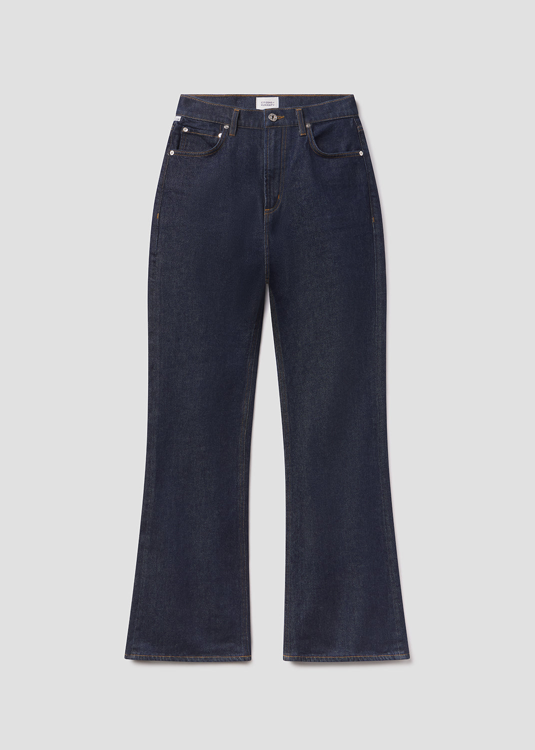 The Kimberly is a high-rise flare inspired by classic ’70s silhouettes, designed to elongate the leg and contour the waist. Crafted from comfort stretch denim with a super soft hand, it offers lasting shape and all-day ease. The Helia wash—a clean, dark indigo rinse—adds a polished, versatile finish. Style with slim knits or structured shirting for a clean look.