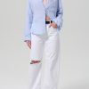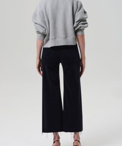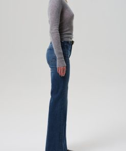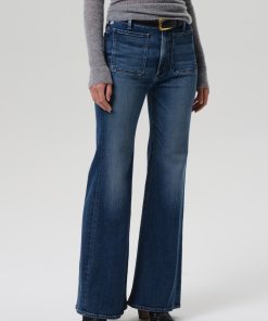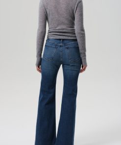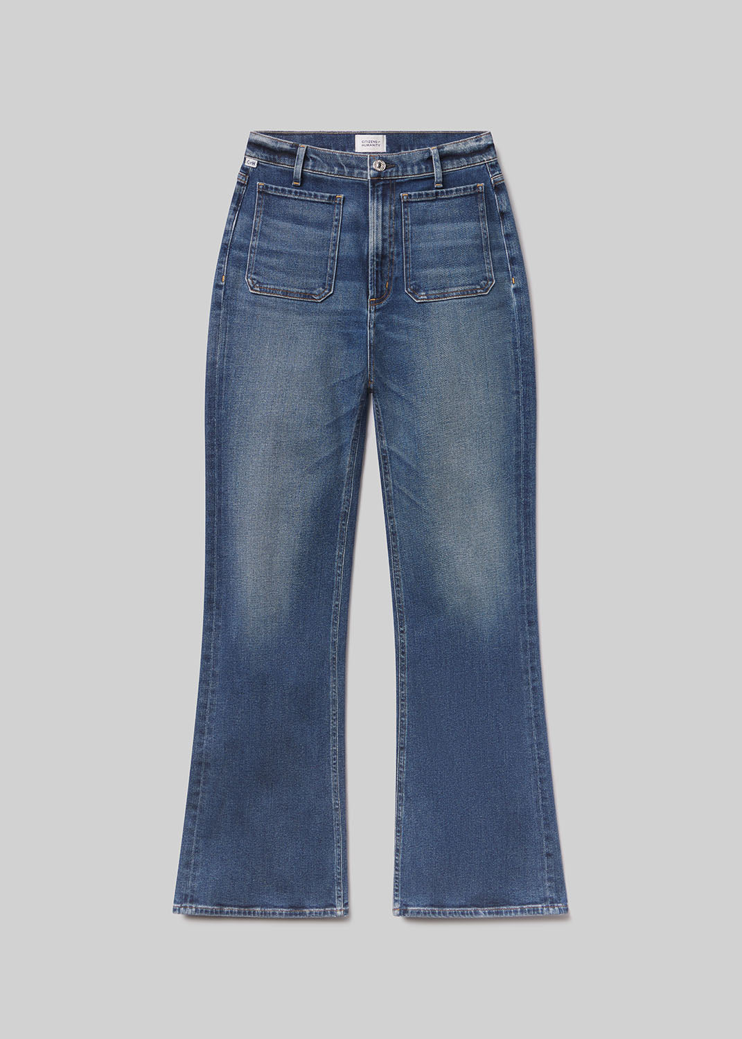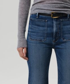 The Kimberly is a high-rise flare designed to elongate the leg and contour the waist. This version is finished with front patch pockets for a subtle utilitarian twist. Crafted from comfort stretch archive denim with a super soft hand, the Abalone wash—a medium indigo with fading and marbling—adds a vintage-inspired finish. Style with crisp shirting or fitted knits for an effortlessly polished look.