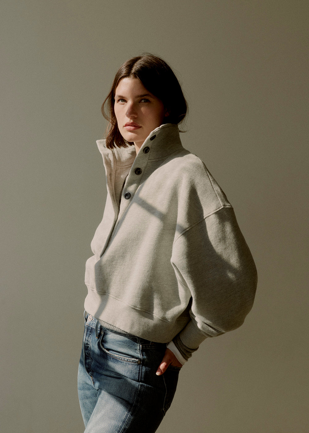 The ‘Mirelle’ is a modern update to the classic sweatshirt, crafted from soft brushed fleece with a plush, cozy feel. Designed with a high funnel neckline and button closure, the relaxed silhouette offers warmth and polish in equal measure. Ideal for off-duty layering or elevated lounging.