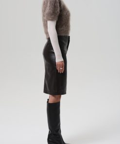 Looks Like: Luxurious chocolate brown leather pencil skirt with slit