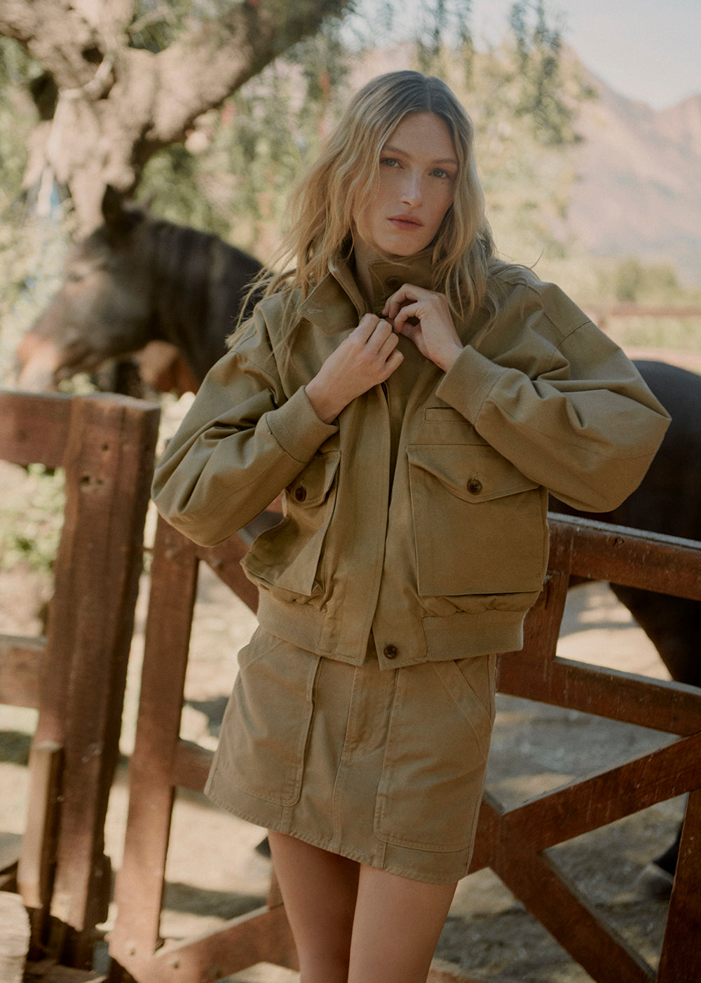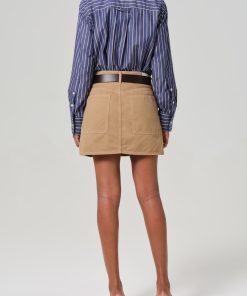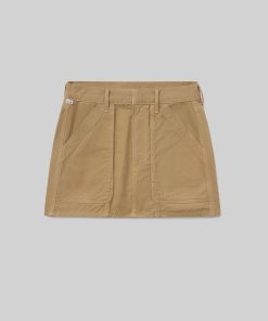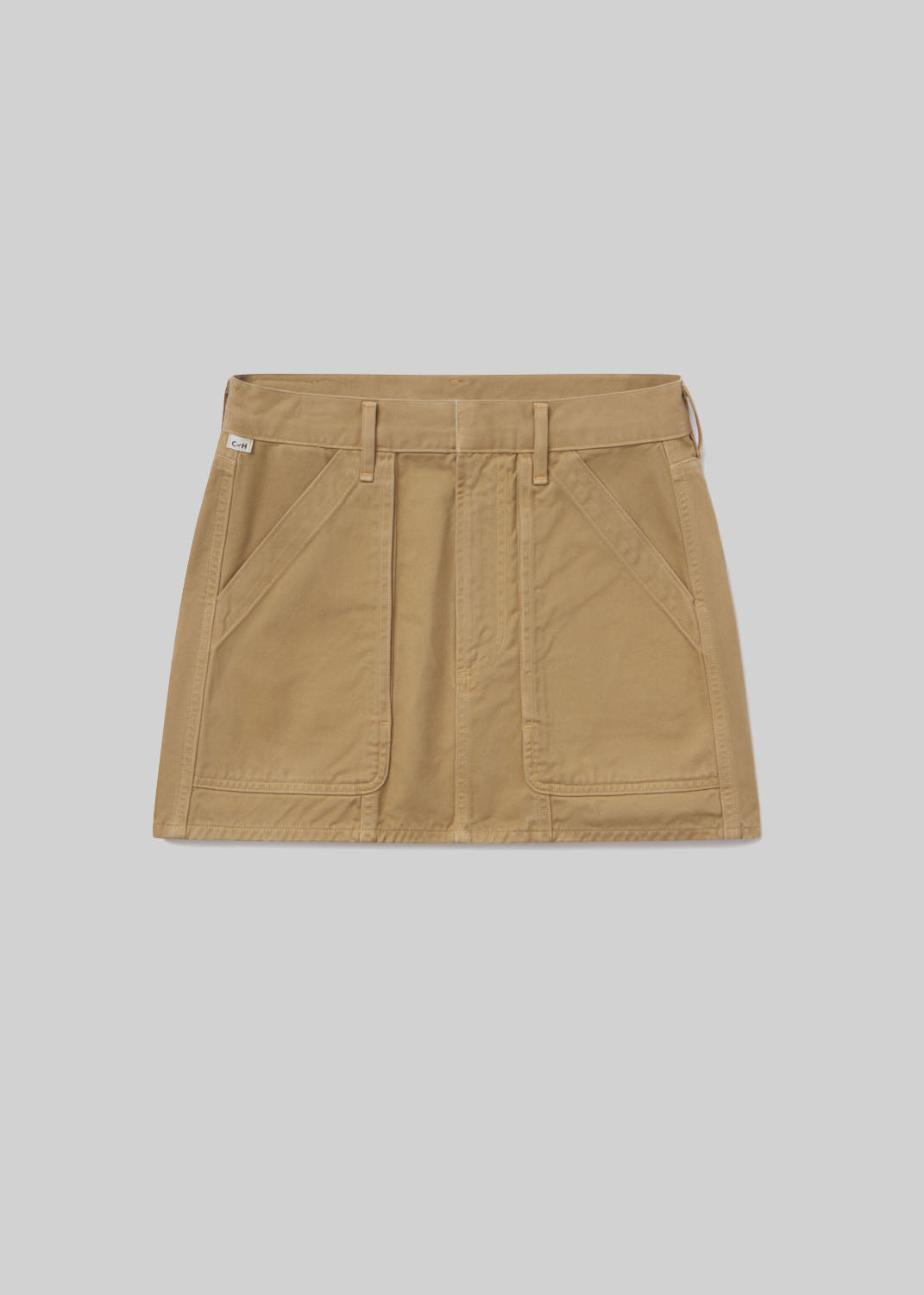 Looks Like: Medium khaki utility skirt with a clean hem and long front pockets