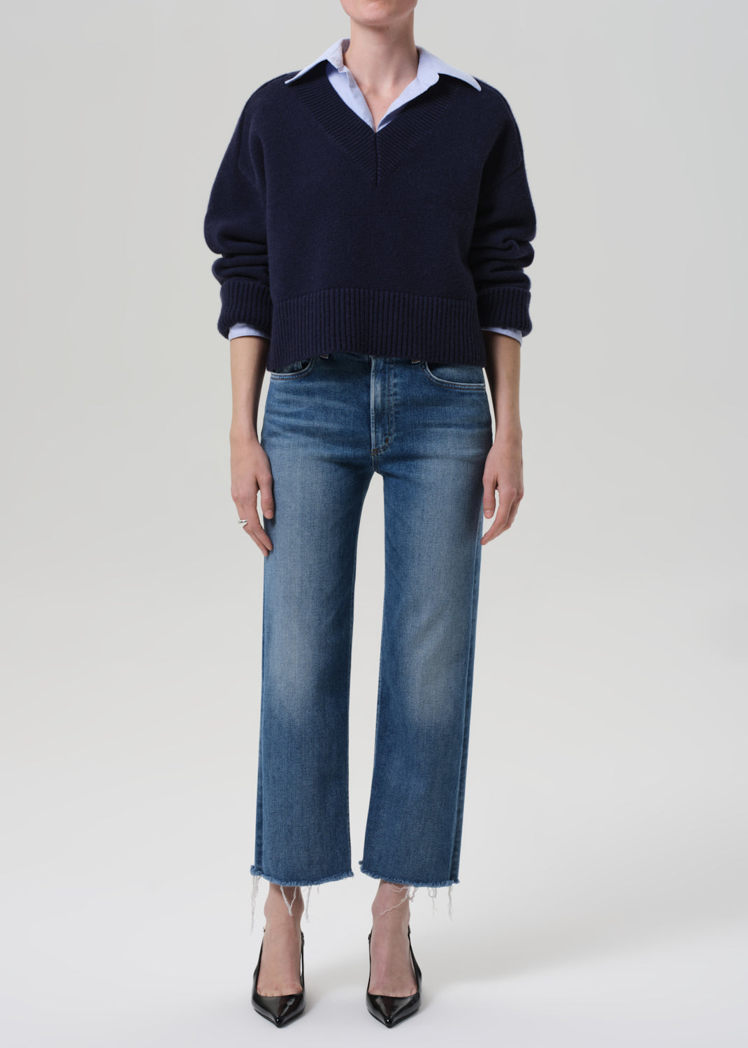 The ‘Palma’ is a modern straight leg with a streamlined, ankle-skimming cut. Crafted from soft stretch denim with a lightweight feel, it’s designed for everyday comfort and ease. Cooper is a classic indigo wash with soft whiskering—style it with anything from a tucked knit to a relaxed blazer.
