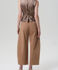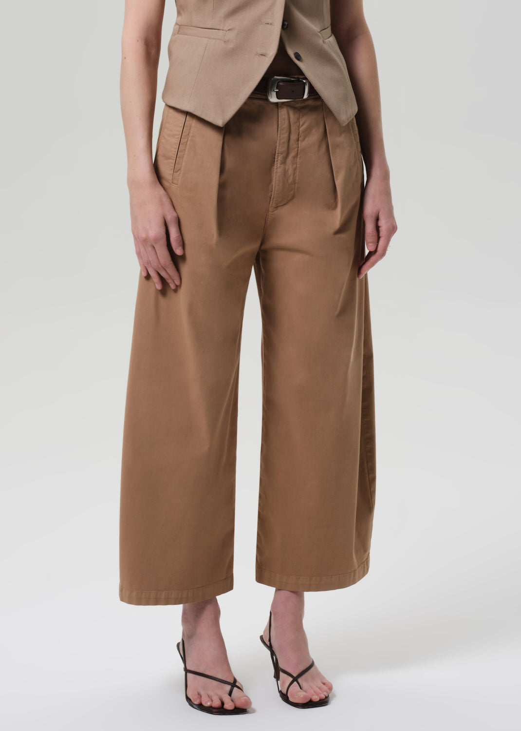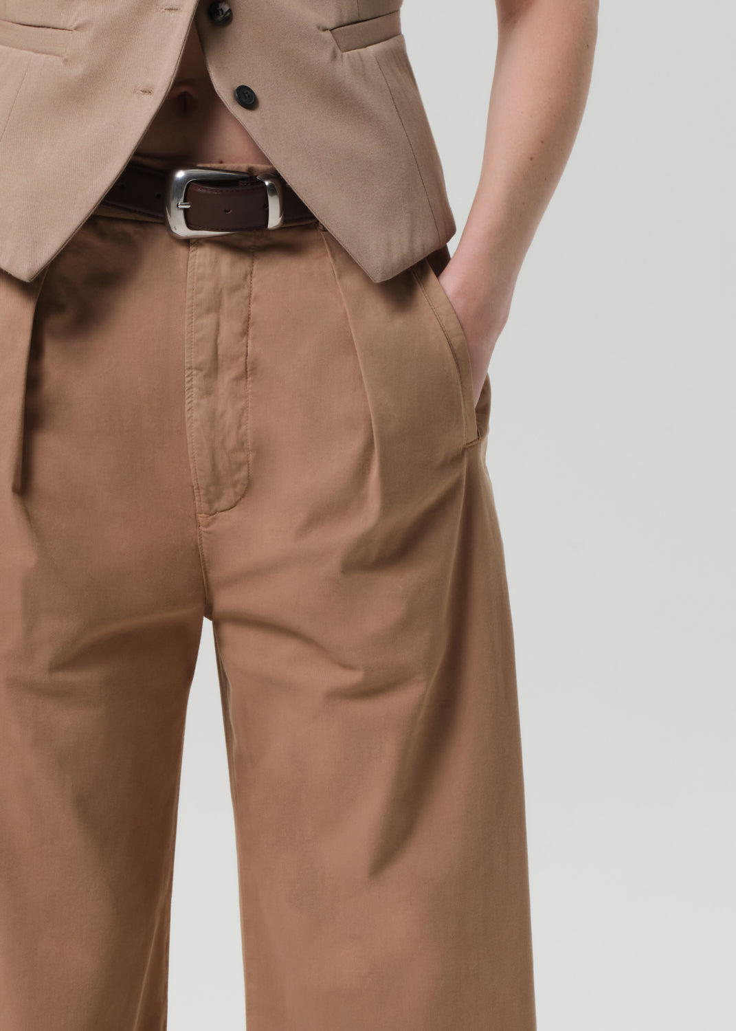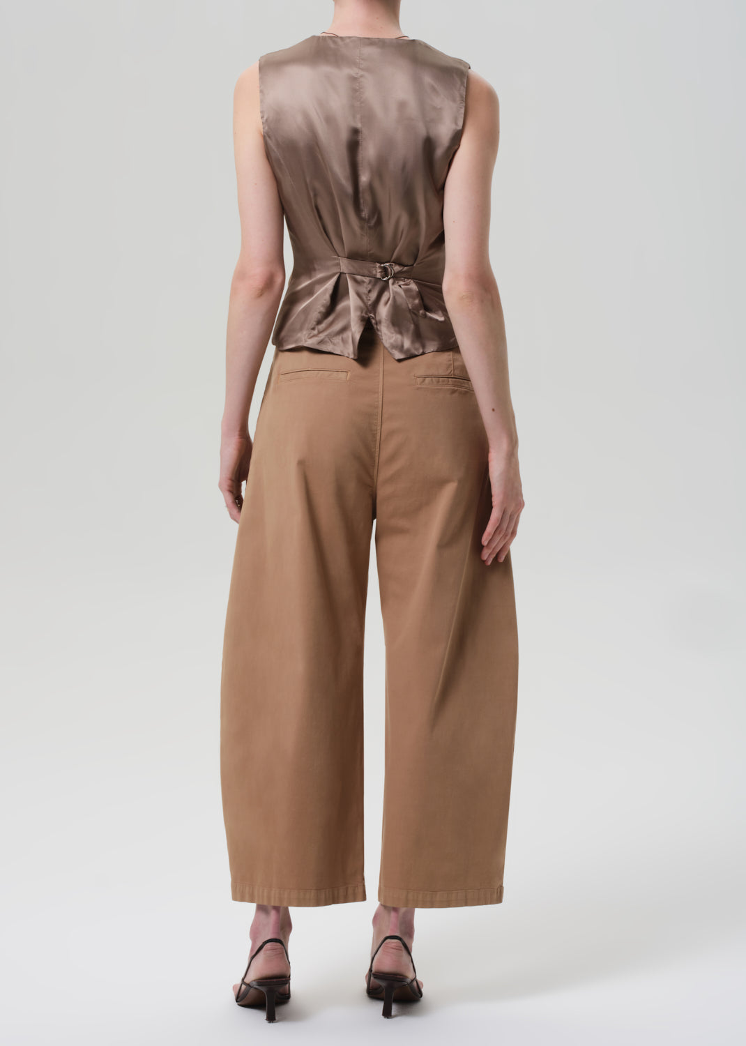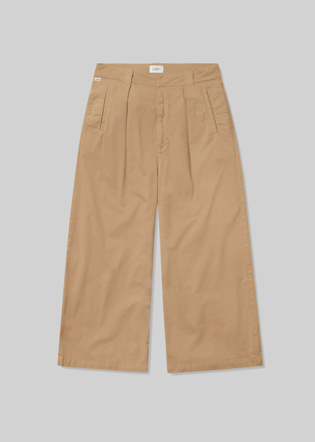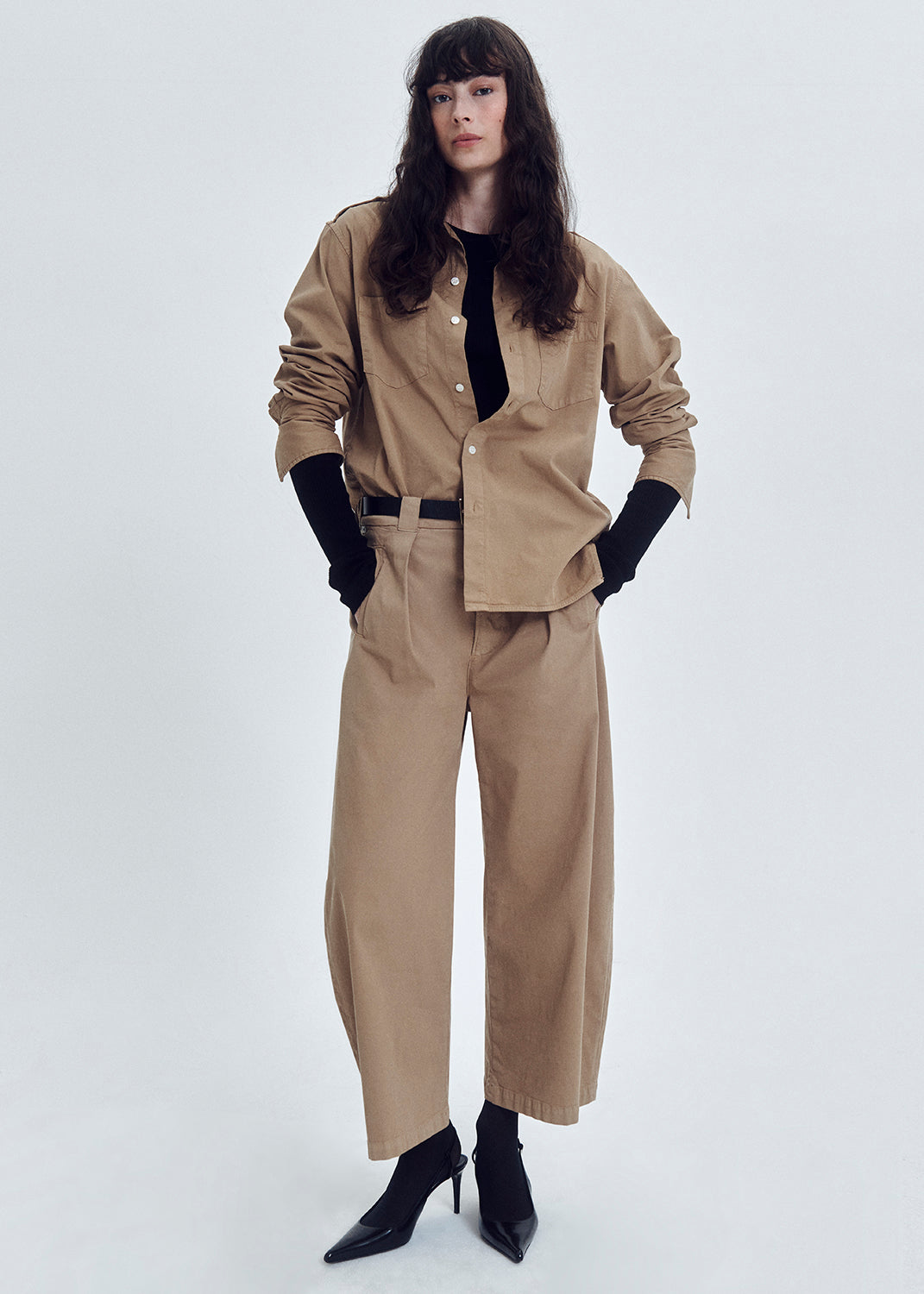 The Cara Trouser is a tailored essential with a relaxed attitude, cut from lightweight stretch twill with a soft, vintage-inspired hand. Designed with a high rise, cropped length, and subtle front pleats, it offers a clean yet effortless silhouette. The Nano shade—a medium to dark khaki—adds a grounded, utilitarian feel—ideal with crisp shirting or relaxed knits.