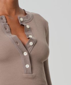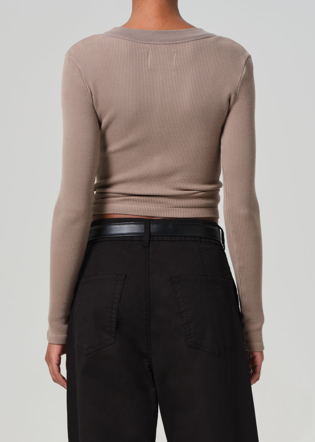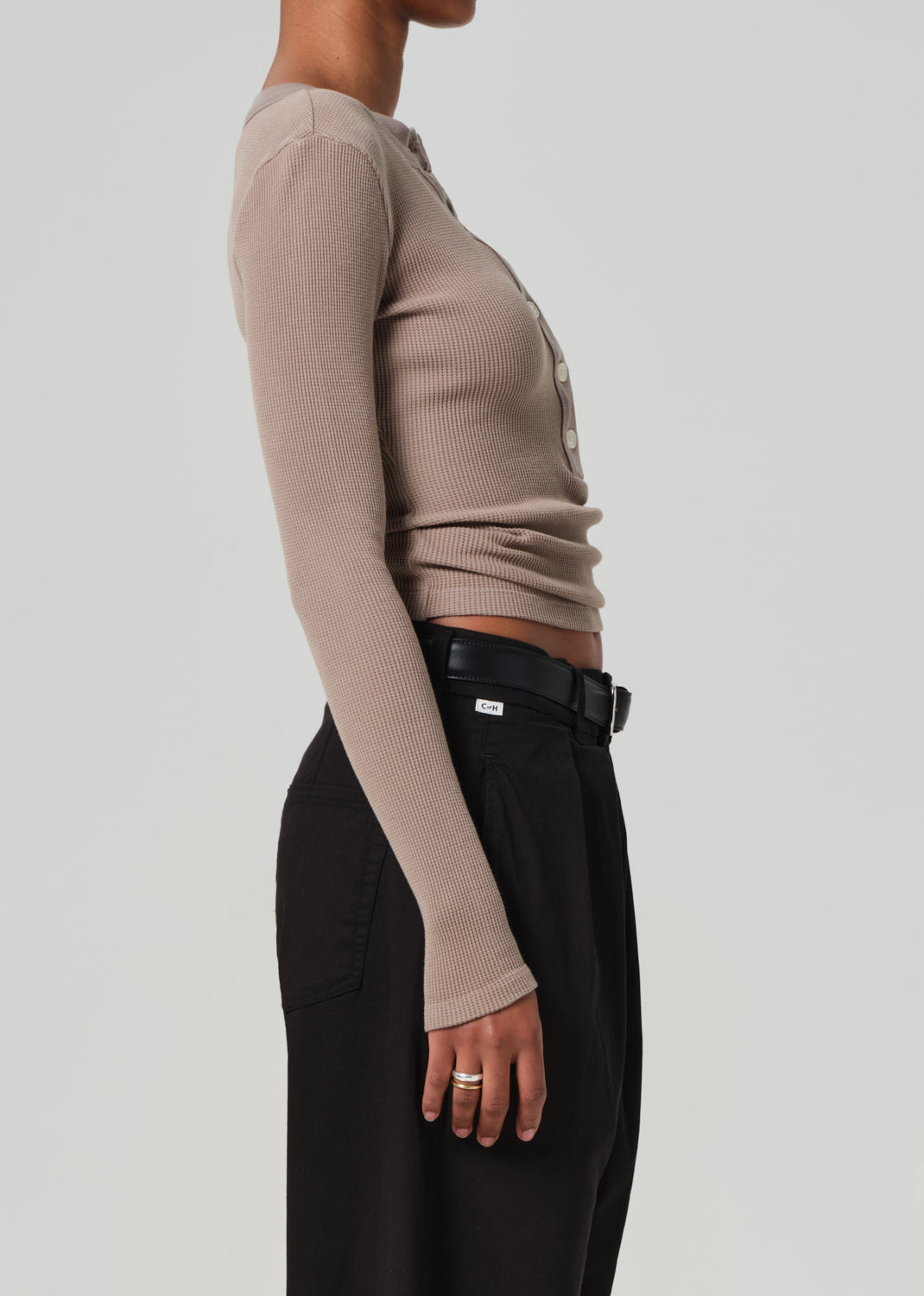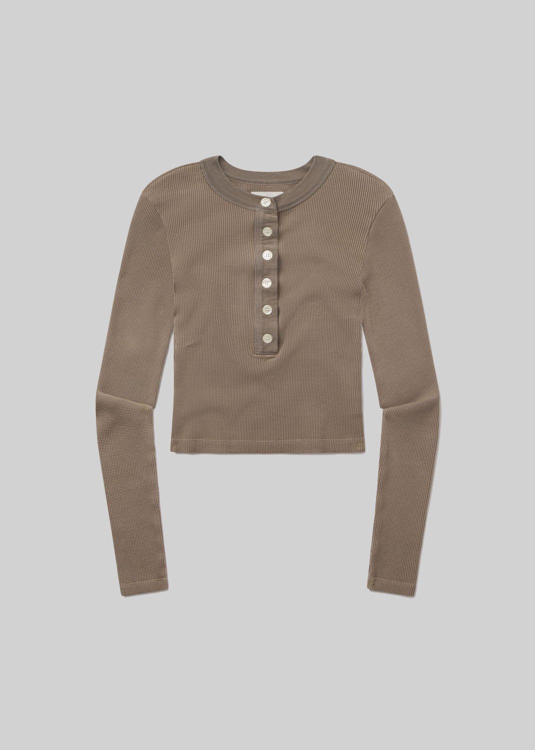 Designed from a form-fittingwaffle rib, this versatile henley can be worn fully buttoned or undone for a more relaxed look.