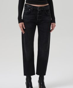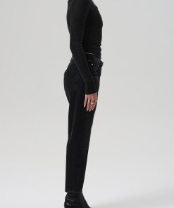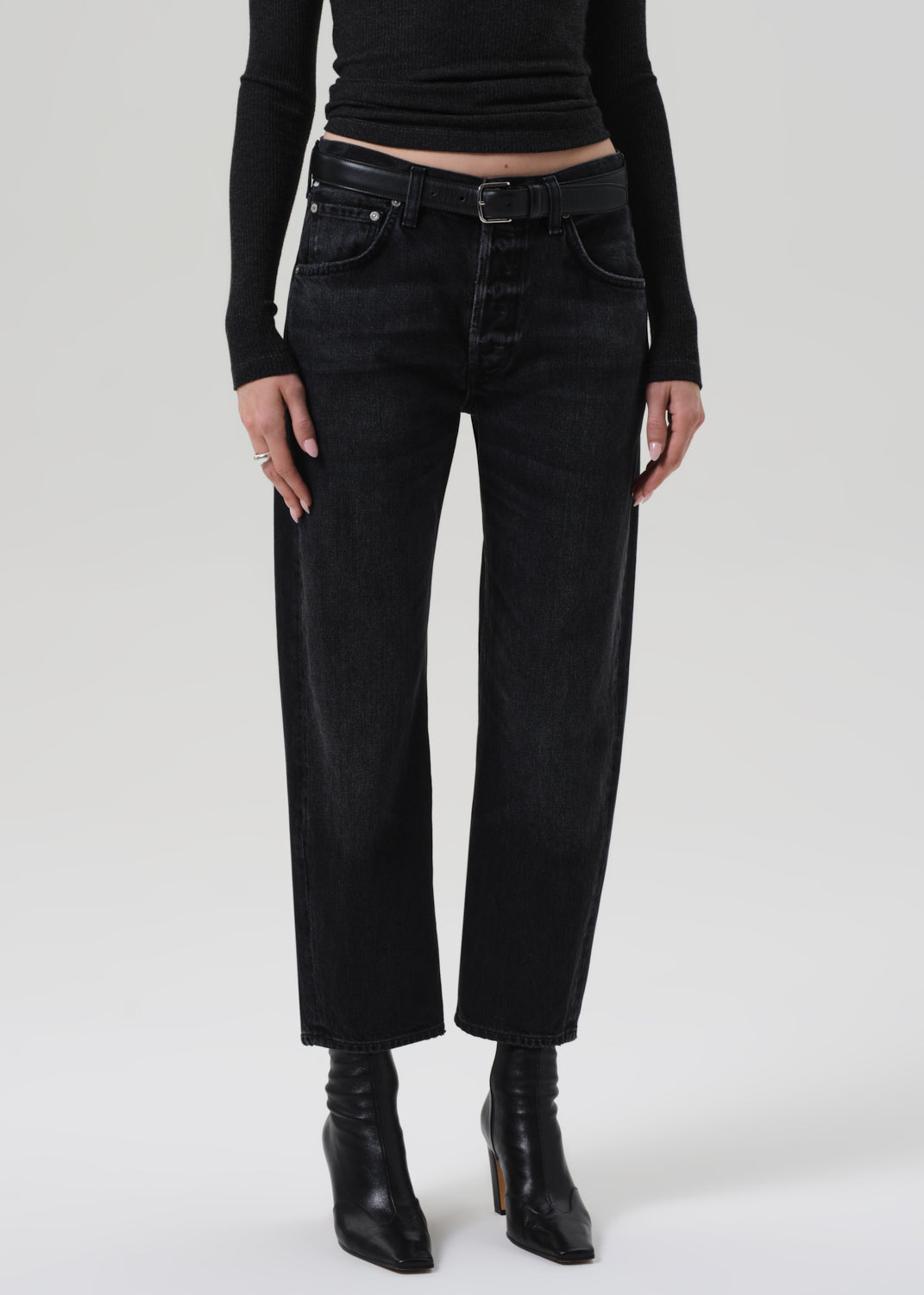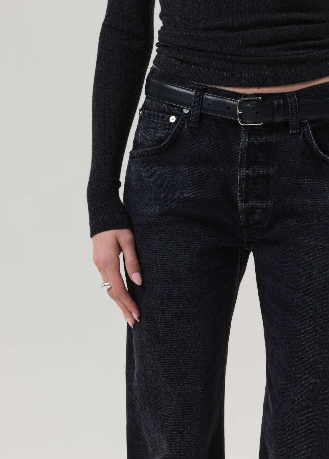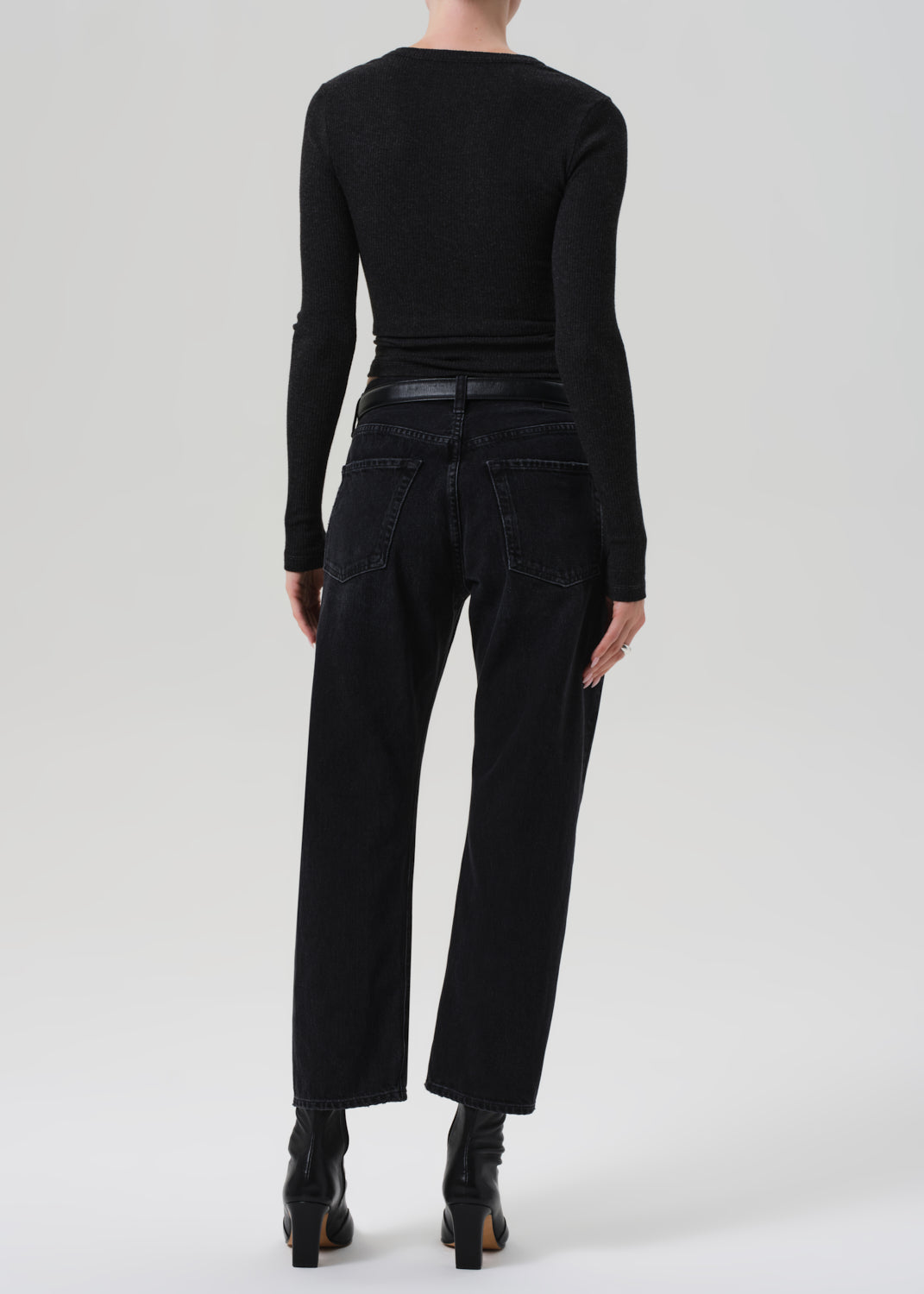The Winslow is a modern take on the boyfriend jean, designed with a low rise and a relaxed fit through the leg. Crafted from rigid regenerative cotton with a soft hand, it holds its shape while offering an easy drape. Raine’s washed black denim gives the silhouette a softened, worn-in edge—ideal styled with everything from a boxy tee to a structured blazer.